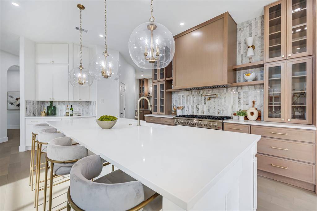 Inside, you'll find engineered hardwood floors, a tandem 3-car garage, and a secure electric driveway gate. The chef's kitchen serves as the heart of the home, showcasing quartz countertops, an oversized waterfall island, a gas range, a walk-in pantry, and custom designer finishes.