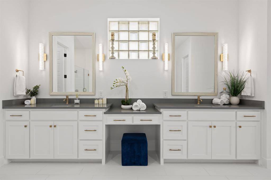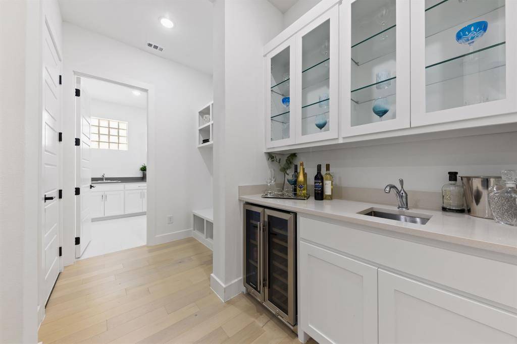 The light-filled kitchen & living areas showcase elevated finishes throughout. An oversized island anchors the space, complemented by a 48-inch built-in refrigerator, wine & beverage refrigerator, premium KitchenAid appliances, ceiling-height cabinetry, additional windows added to capture the greenbelt and water views & designer lighting that enhances the home's clean, modern aesthetic.