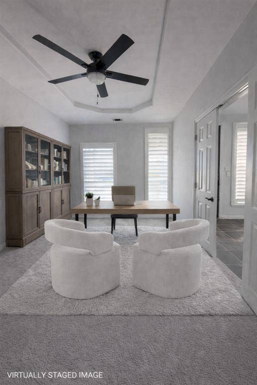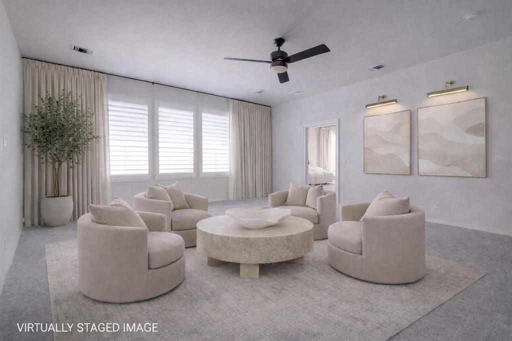 The primary suite provides a comfortable retreat, while additional bedrooms offer flexibility for guests, home offices, or multi-generational living. Plantation shutters throughout the home add both style and function, and the primary closet includes a built-in safe that will convey.