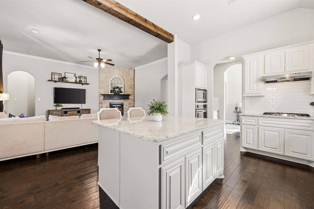Welcome to 2451 Lusitano, a beautiful, better than new First Texas, East-facing home where timeless elegance meets modern innovation in the heart of Celina. This extraordinary home has been meticulously upgraded to offer unparalleled comfort and style. As you step inside, you'll immediately notice the heightened sophistication, with custom matching archways and soaring 11' ceilings that create a sense of grandeur throughout. The entryway and living room are enhanced by crown molding and upgraded 6” baseboards, adding an extra touch of refinement. The heart of the home, the gourmet kitchen, is a chef's dream. It features a oversized custom island, and showcases stunning engineered hardwood flooring that extends seamlessly through the kitchen, dining, entry, and living spaces. The custom mitered cabinet doors exude craftsmanship, while the home's Savant system allows you to control kitchen and living room lights right from your phone. The living area, pre-wired for ceiling speakers, offers the perfect ambiance for entertaining or relaxing. Step outside onto the extended brick back patio, also pre-wired for sound. It's a true outdoor oasis, ideal for hosting gatherings or unwinding in peace. The primary suite is a luxurious retreat, with a spa-like ensuite bath and a spacious walk-in closet. Even the guest areas and additional bedrooms shine with upgraded carpet padding for maximum comfort. Every detail has been thoughtfully considered, including built-in pest control for year-round peace of mind. Technological upgrades abound, with an Ecobee WiFi thermostat for energy efficiency and a Savant system that also integrates the door camera and exterior lighting. Whether you're adjusting the home's climate, dimming the lights, or checking who's at the door, it's all effortlessly accessible from your phone. Located in a desirable community, this home offers proximity to top-rated schools, dining, recreational opportunities, and the charm of Celina's growing downtown.