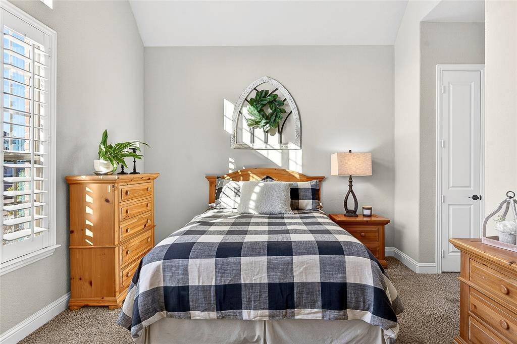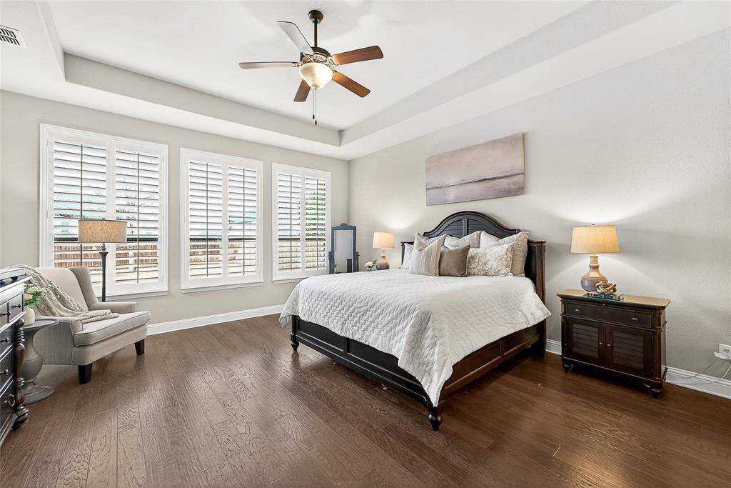 Located in Prosper within Frontier Estates which has no MUD or PID and zoned to Prosper ISD, this thoughtfully designed home offers a flexible floor plan, abundant natural light, and a third-acre lot with space for a future pool.Tall ceilings and oversized windows create an open feel throughout the main living areas. Espresso hardwood floors, custom lighting, and a sweeping spiral staircase add architectural character. The kitchen features a large granite island, marble and granite countertops, gas cooktop, double ovens, custom Hoffman cabinetry, concealed spice storage, and a built-in planning niche. It opens to the living room with a gas fireplace and views of the backyard. The primary suite is located on the main level and includes tray ceilings, a spa-style bath with frameless walk-in shower, soaking tub, stone flooring, private water closet, and a custom walk-in closet. A guest suite with private bath is also on the first floor, along with a dedicated office, mudroom, spacious laundry room, and a flexible bonus room suitable for a gym, nursery, playroom, or additional workspace. Upstairs includes a media room, loft-style living area, and two secondary bedrooms, each with private baths and walk-in closets. The fully fenced backyard sits on approximately one-third of an acre and includes a covered patio with natural gas hookup, offering space for outdoor living and future pool plans. Additional features include spray-foam insulation, smart-home wiring, Wi-Fi thermostats, LED lighting, gas water heaters, irrigation system, under-stair storage, and a three-car garage. Frontier Estates amenities include a community pool, splash pad, walking trails, and convenient access to shopping, dining, and major roadways.