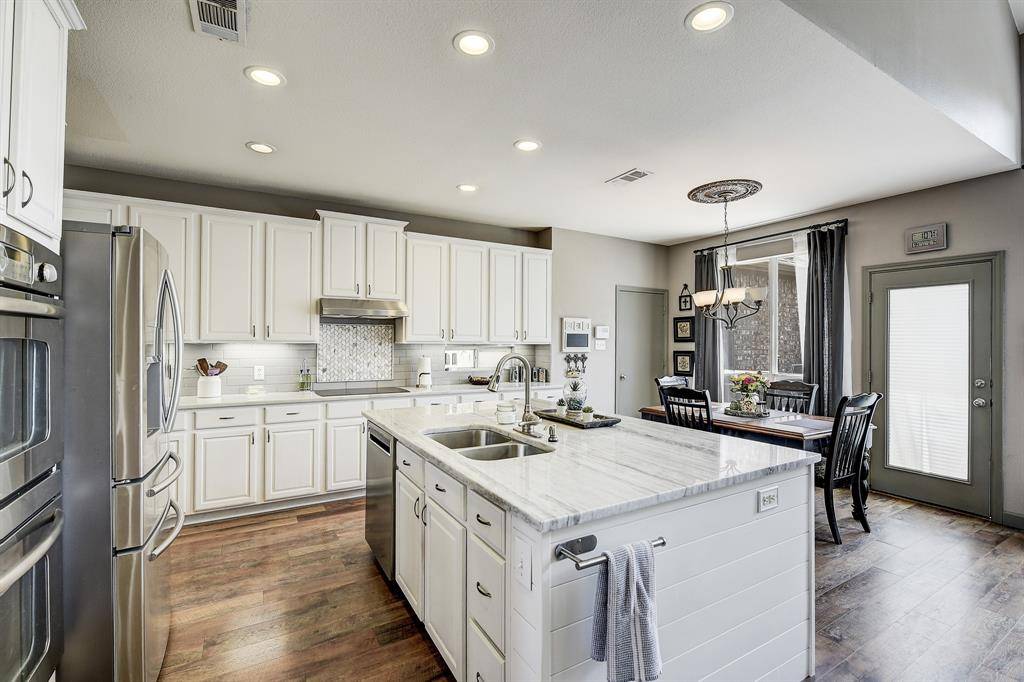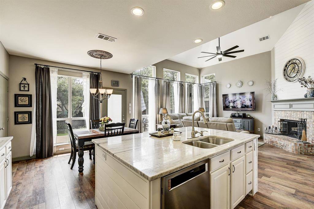 Beautifully updated home in sought after community in the heart of Frisco. Light and bright Chef's kitchen with quartzite countertops, stainless steel appliances, and huge island. Spa like oversized Owner's Retreat with enclosed private outdoor patio for relaxing with your coffee, or winding down in the evening. Quartz countertops in all bathrooms are a recent improvement. High quality heavy duty laminate floors throughout most of the main floor.