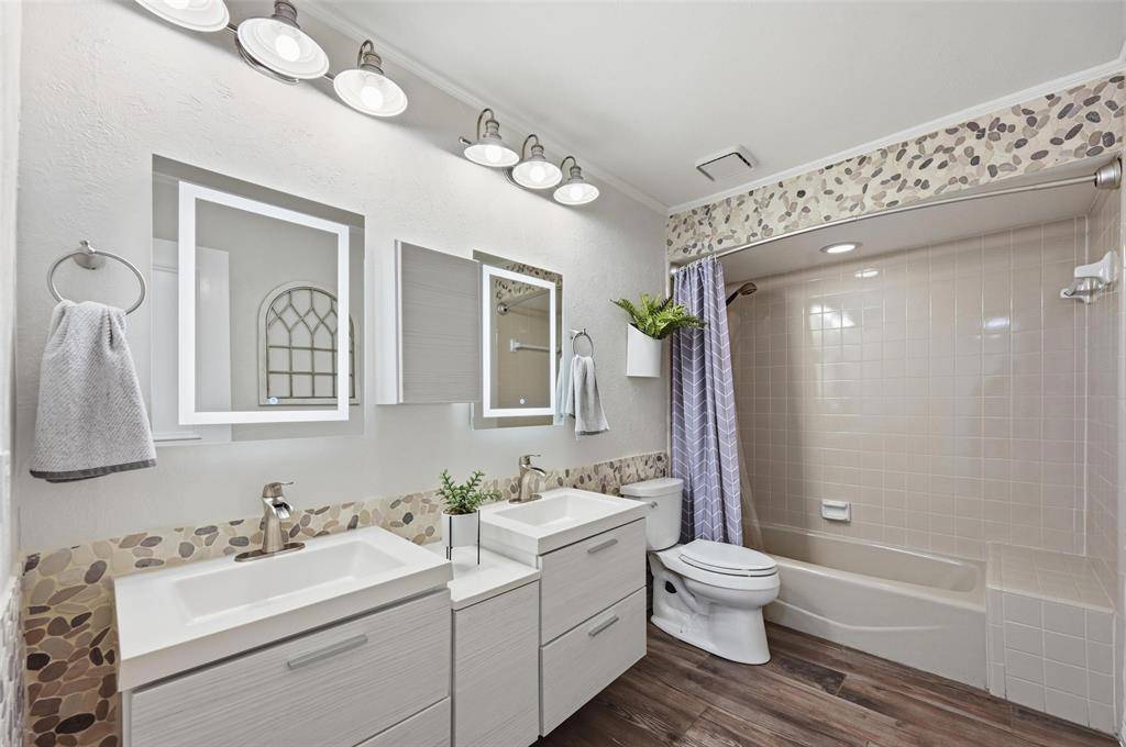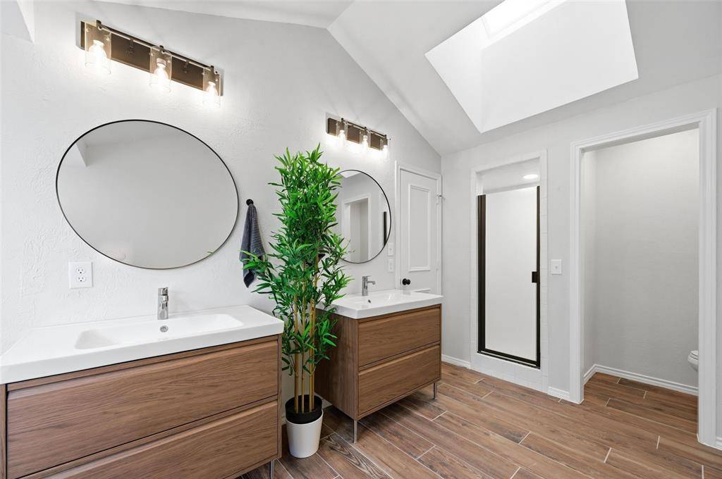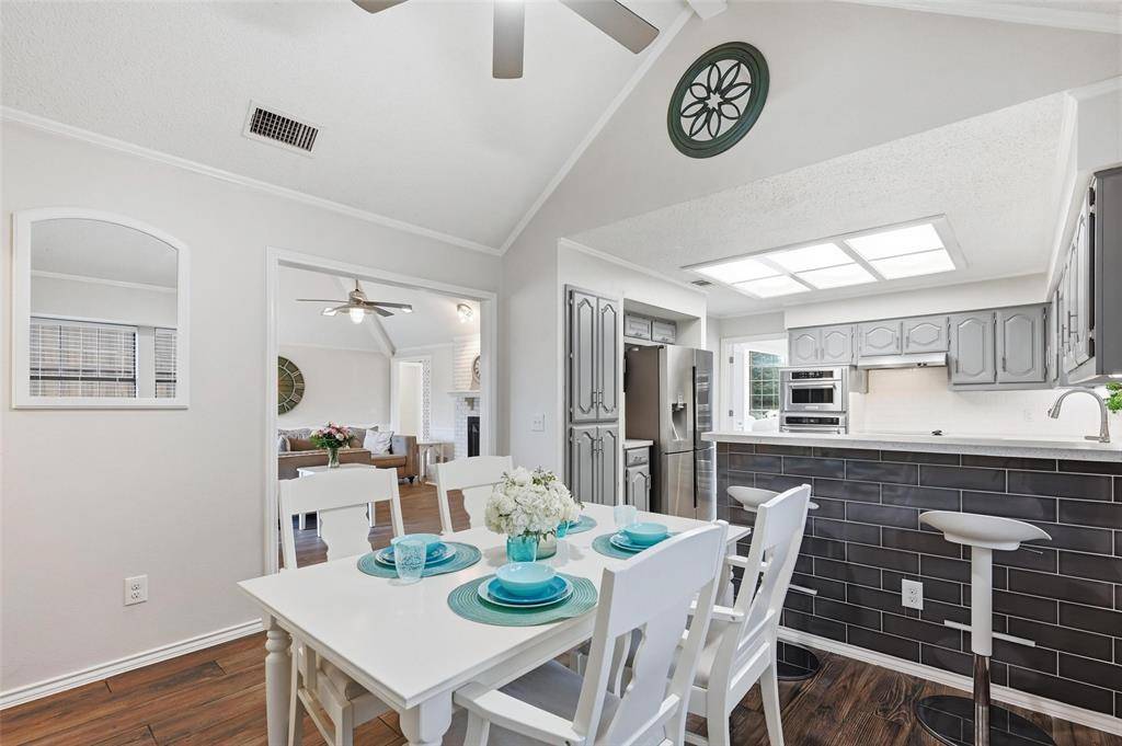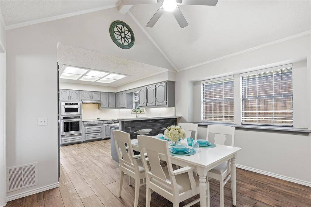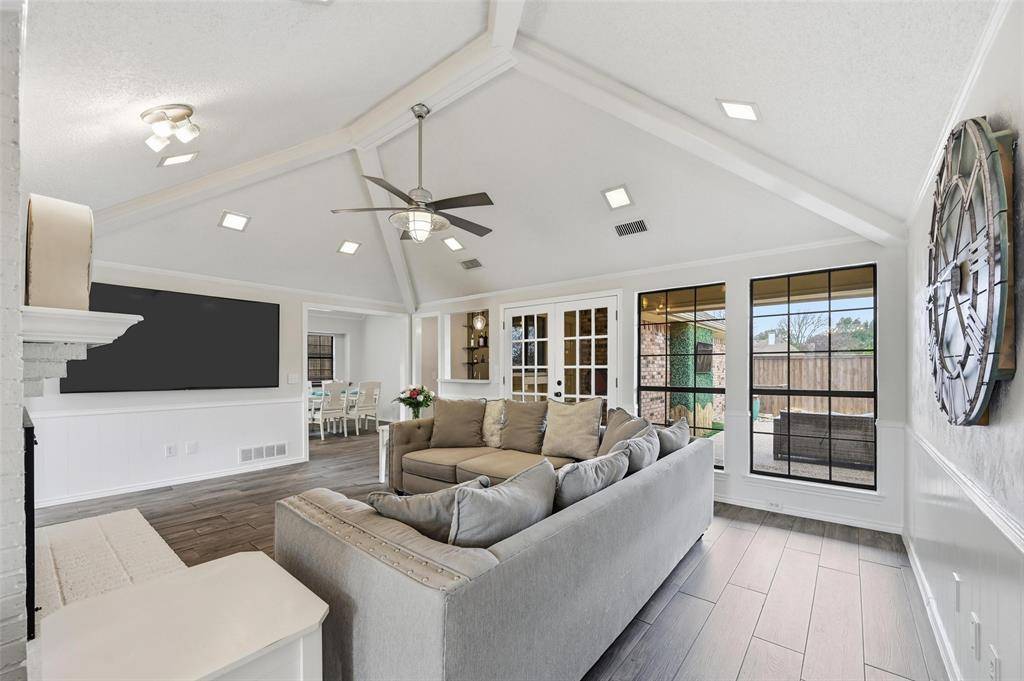 This stunning single-story home is a rare opportunity combining thoughtful updates, flexible living space, and resort-style outdoor living—all in one beautifully maintained package. Featuring 4 spacious bedrooms and 3 and one-half baths, this layout offers ideal functionality. Step inside to soaring vaulted ceilings, rich wood-look flooring, and an abundance of natural light streaming through oversized arched windows. The formal living and dining areas create an elegant first impression with detailed wall covering, designer lighting, and a dual-sided fireplace that anchors the space with warmth and character. The heart of the home is the fully updated kitchen, painted cabinetry, stainless steel appliances, subway tile backsplash, double oven, and a breakfast bar that opens seamlessly into the family room. The adjacent breakfast nook overlooks the backyard, making everyday meals feel bright and inviting. The expansive primary suite features high ceilings and an ensuite bath, complete with separate vanities, dual sinks, a soaking tub, and a separate shower. Additional bedrooms are generously sized and complemented by updated secondary baths. A large laundry room with built-in cabinetry and sink adds everyday convenience. Step outside to your private backyard retreat, where a sparkling pool, extended patio, and outdoor entertaining space create the perfect setting for gatherings year-round. Located in a highly sought-after area with excellent schools, this meticulously cared-for home is designed for everyday living and entertaining. Don't miss your opportunity to make it yours.