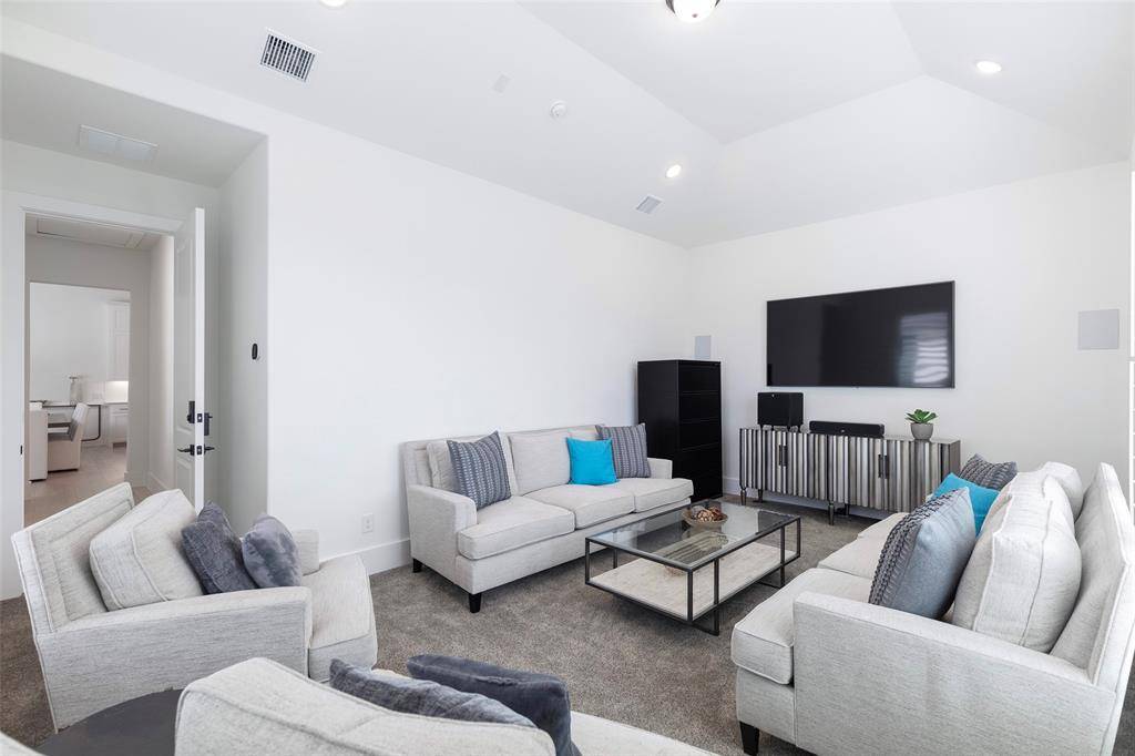 This SINGLE-STORY home in Mustang Lakes, one of Celina's most sought-after master-planned communities, is designed for both serious entertaining and wine collection. The gated courtyard features outdoor speakers that set the tone for refined gatherings. At the heart of the home is a remarkable, custom walk-in, temperature-controlled wine room with up to 1000 bottle capacity. Enclosed in wrought iron with LED lighting, the space includes a tasting bar, an adjoining sitting area, and a custom-built service armoire, over $100K enhancement. Soaring vaulted ceiling and open-concept living spaces transition seamlessly to the outdoors through a dramatic folding glass wall that opens the living room to the backyard. An electric screen allows the patio to be fully enclosed when desired, creating year-round flexibility. An in-home media system extends throughout the residence, including all common areas and primary suite. Natural light floods the kitchen with a huge island, double ovens, pot filler, and a generous amount of ceiling height cabinetry and quartz counterspace. All bedrooms have ensuite baths. The backyard is designed to rival private resort settings, showcasing a custom-designed pool with hot tub, tanning bed, waterfall feature, programmable light show, and firepit. A stand-alone, covered outdoor Cabana kitchen provides extensive functionality with a grill, sink, refrigerator, storage, bar seating, and generous countertops, ideal for both intimate evenings and large-scale entertaining. An outdoor half bath with a dedicated pool storage closet adds thoughtful convenience. Beautiful landscaping completes the experience with seven RH Zinc planters, custom lighting, and irrigation, creating architectural symmetry and evening ambiance. Offering the ease of single-story living combined with architectural wine presentation and true indoor-outdoor integration, this Mustang Lakes residence delivers distinction, scale, and lifestyle in one extraordinary home.