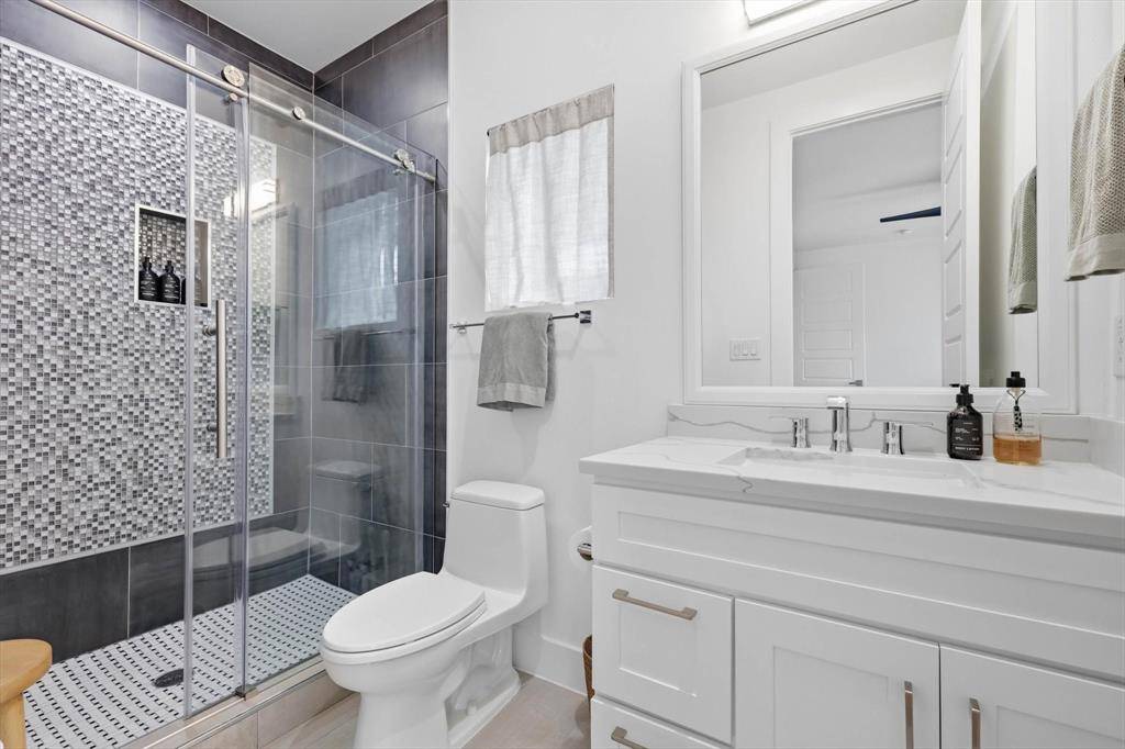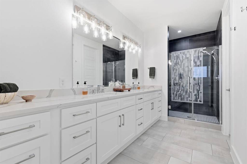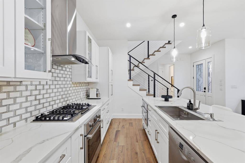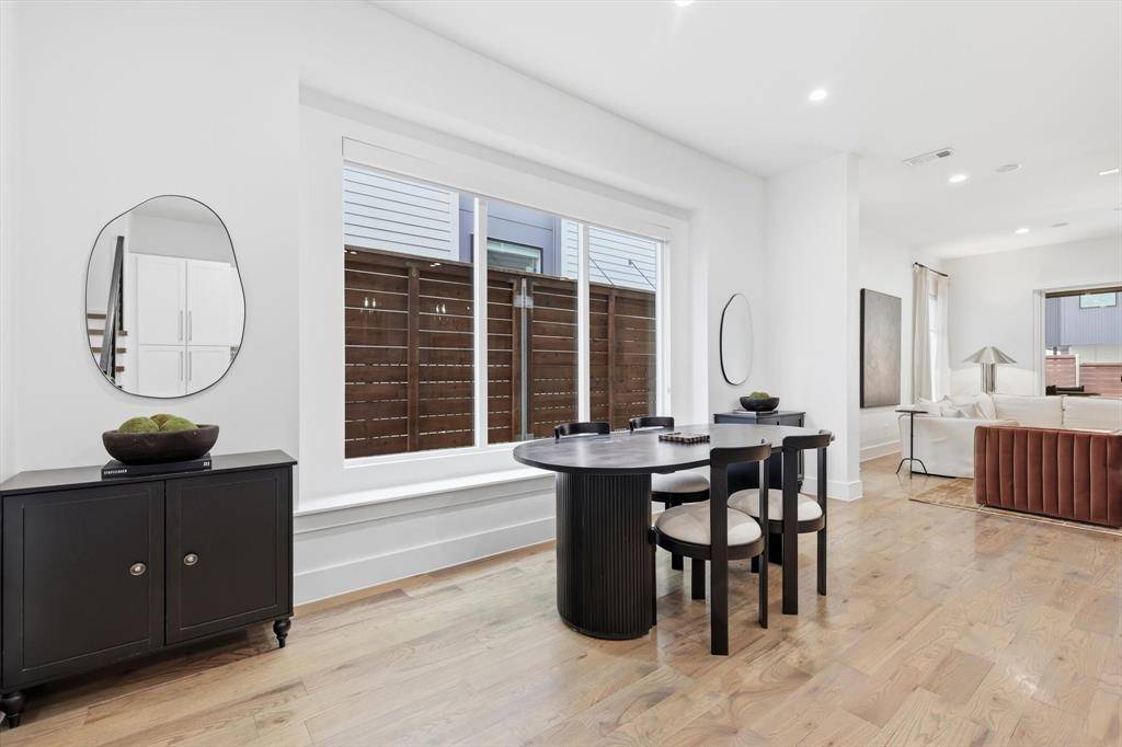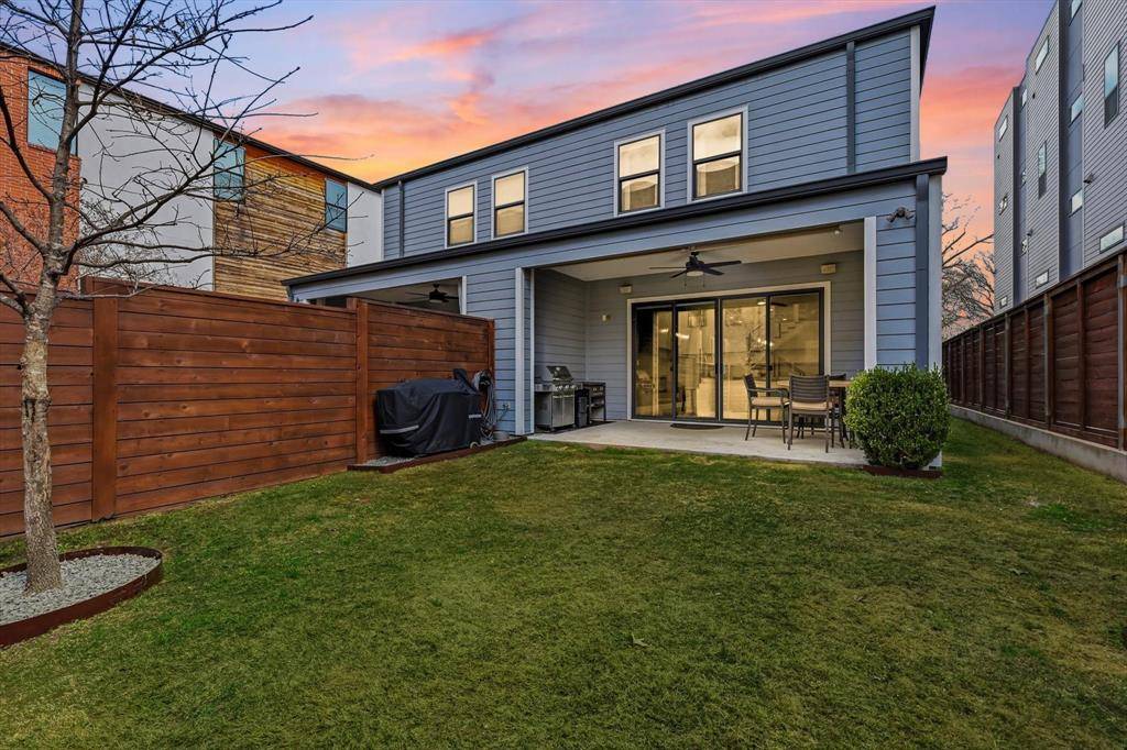 Completed in 2020 and impeccably maintained, this light-filled contemporary residence blends refined design with effortless urban living in one of Dallas' most vibrant locations. At the heart of the home, a stunning quartz waterfall island anchors the chef's kitchen, complemented by classic shaker cabinetry and a suite of Bosch 500 Series appliances. The adjoining dining space is both inviting and elegant, perfect for intimate dinners or lively gatherings. The large living room offers flexibility for everyday comfort and elevated entertaining, featuring built-in speakers and a customizable fireplace. Expansive glass doors open seamlessly to the generous backyard, where a covered patio with shade screens and lush green lawn create a private outdoor retreat designed for indoor-outdoor living. Thoughtful details enhance daily livability, including under-stair storage and a spacious laundry room with cabinetry and countertop workspace. Real hardwood floors run throughout the home, while custom window shades provide both style and privacy on every level. Upstairs, generously sized bedrooms are filled with natural light and each enjoy their own private full bath and walk-in closet, an exceptional layout for guests or family. A versatile upstairs flex space offers the perfect setting for a home office, media lounge, or game area. The serene primary suite is a true sanctuary, complete with a custom-designed closet and a private balcony offering unobstructed neighborhood views. Located just moments from Knox-Henderson, with quick access to US-75 and surrounded by premier shopping and dining, this residence offers a rare combination of modern luxury, thoughtful design, and walkable lifestyle convenience.