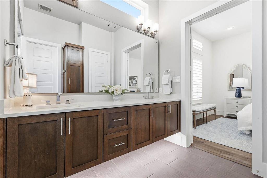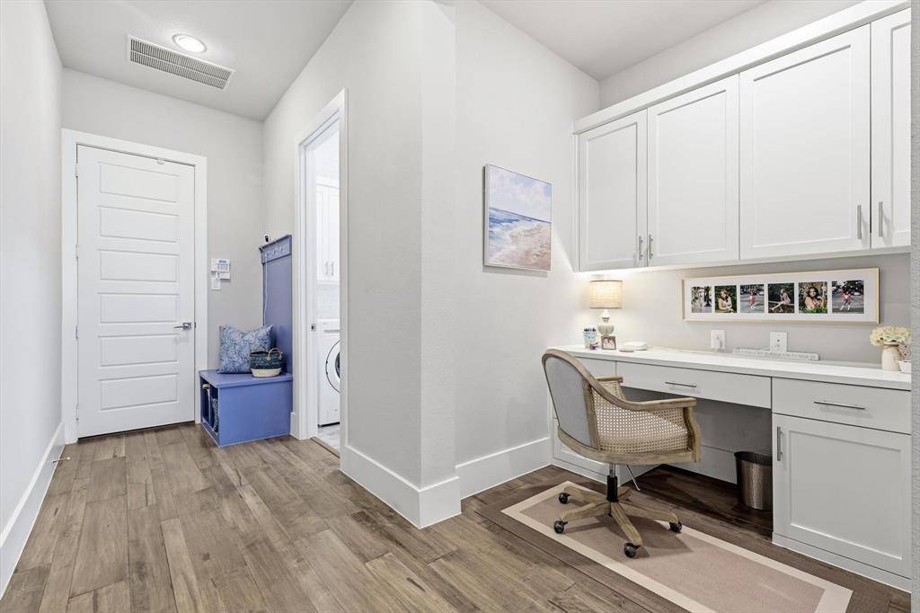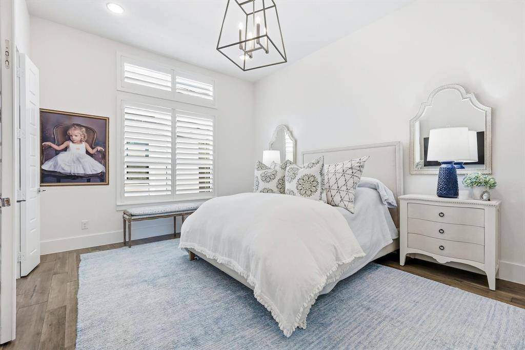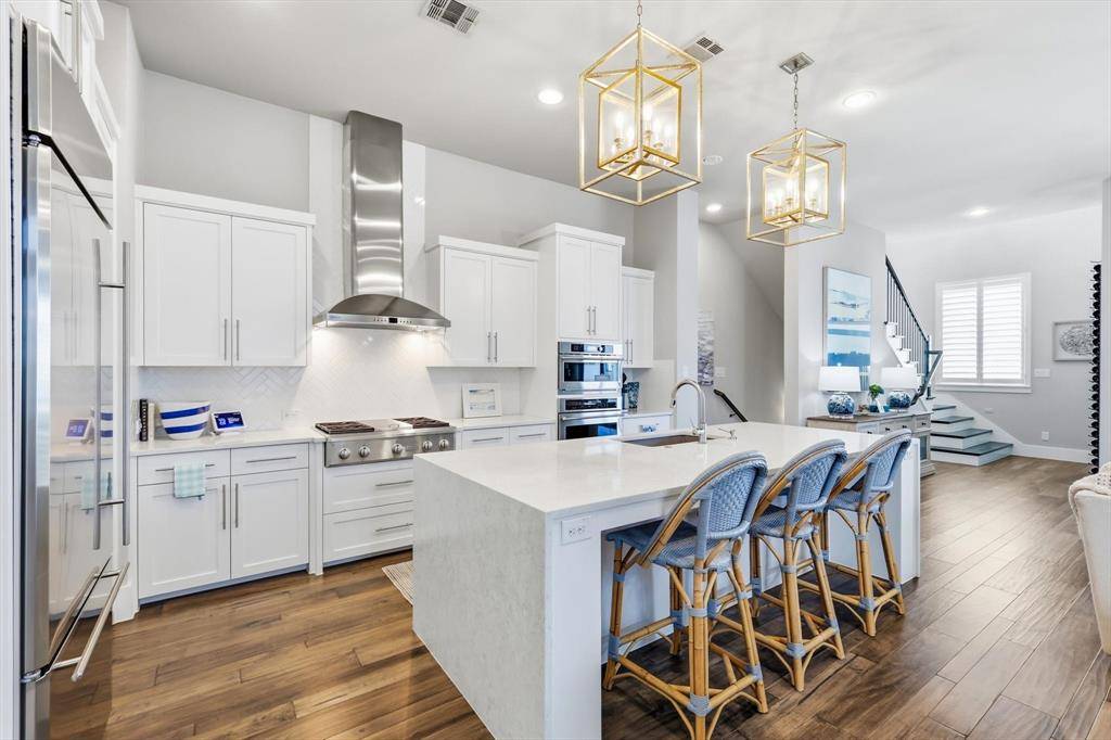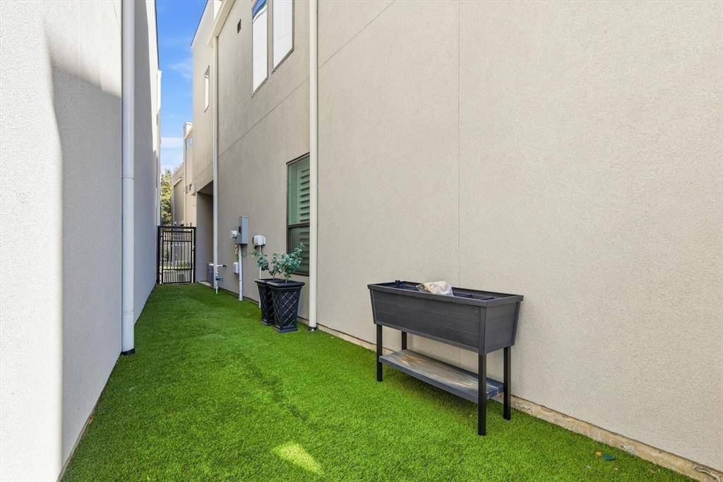 Modern sophistication meets effortless urban living in this architecturally striking three-story residence just steps from Legacy West's premier shopping and dining. Designed with elevated custom details throughout, the home showcases a dramatic waterfall-edge kitchen island, wine refrigerator, rich wood flooring, plantation shutters, seamless glass shower enclosures, and designer tile selections that create a refined, contemporary aesthetic. Even the garage reflects thoughtful upgrades with sleek RaceDeck flooring. The flexible first floor features two private bedrooms, each with its own ensuite bath, along with a built-in office space ideal for today's work-from-home lifestyle. The second floor is the heart of the home, an open, light-filled living space where the designer kitchen flows seamlessly into the dining and living areas. Multi-panel glass sliders extend the space onto a large covered deck, delivering true indoor-outdoor living. The serene primary suite is also located on this level, offering both privacy and convenience. On the third floor, a spacious loft opens to a second elevated deck, the perfect setting for sunset views and evening gatherings. Both upper-level decks are equipped with electric shades, providing privacy and protection at the touch of a button. A fenced side yard with low-maintenance turf adds an additional outdoor retreat. Located in Plano ISD with easy access to Highway 121 and the Dallas North Tollway, this residence offers a rare blend of lock-and-leave convenience, luxury design, and walkable lifestyle.