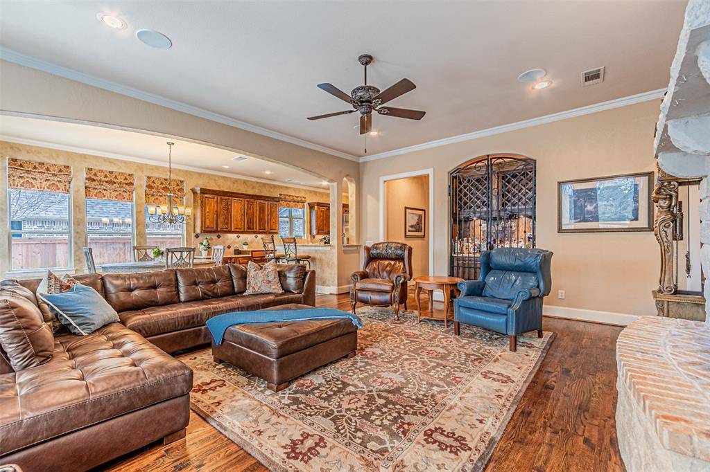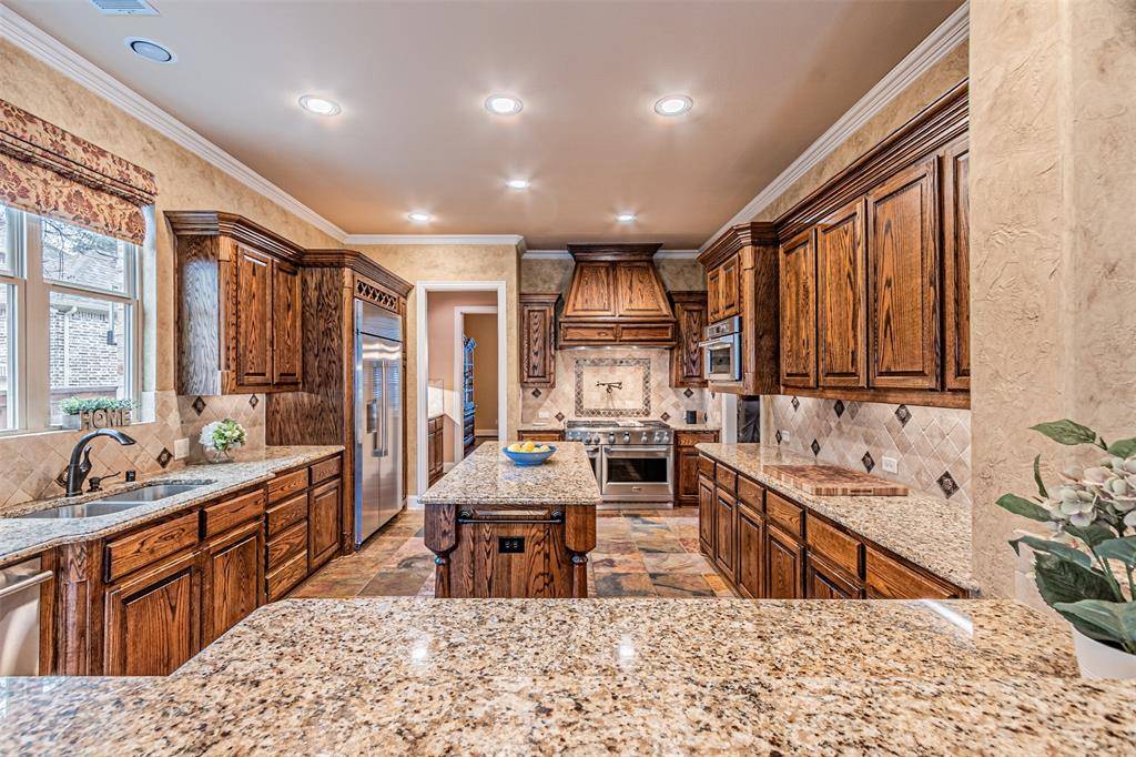 At the heart of the home, the chef's kitchen is beautifully appointed with granite countertops, a built-in Monogram gas range with a professional-grade exhaust vent, pot filler, and built-in refrigerator, all seamlessly opening to generous living spaces with hardwood and slate flooring designed for both everyday living and entertaining. Multiple living areas create an effortless flow throughout the home, while a spacious game room and dedicated media room offer endless opportunities for recreation and relaxation.