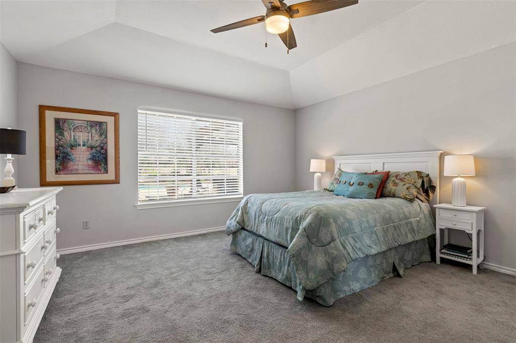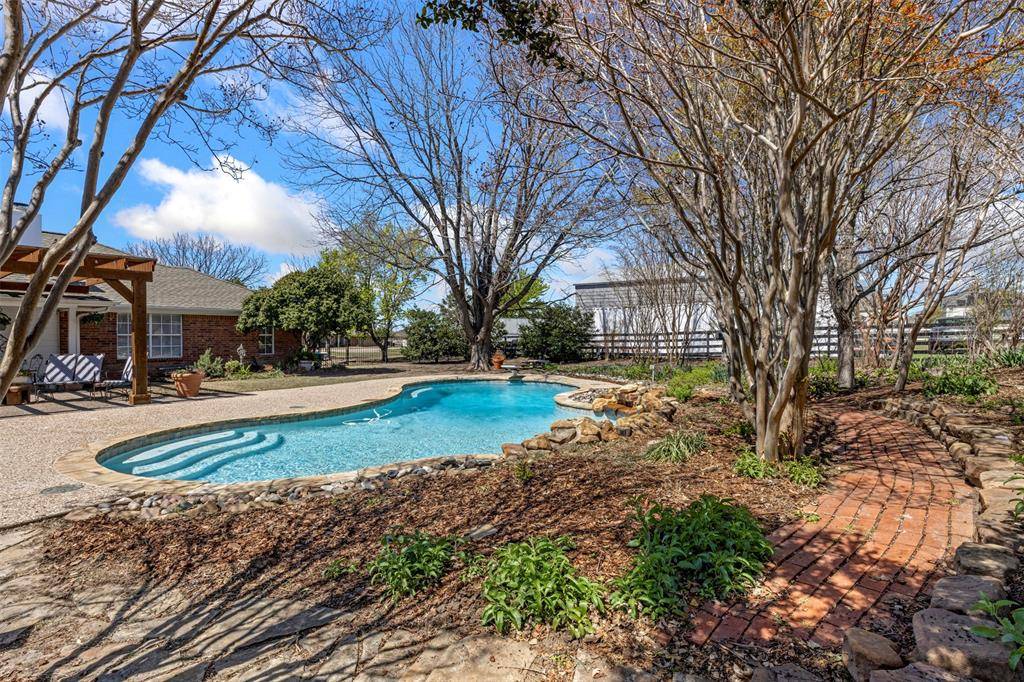 Set on a sprawling 1-acre lot, this exceptional single-story home offers the perfect blend of space and comfort in a prime location zoned to highly sought-after Prosper ISD. Featuring 4 bedrooms, 3 full baths, a dedicated office, and a large game room, the flexible floor plan is designed for both everyday living and entertaining. At the heart of the home, the kitchen is ideally positioned between the spacious living area, breakfast nook, and formal dining room, creating a seamless flow for gatherings. The inviting living room showcases a cozy wood-burning fireplace, while plantation shutters add timeless charm. The private primary suite offers a relaxing retreat with a garden tub, separate shower, and ample space to unwind. Step outside to your own backyard oasis complete with a sparkling saltwater pool and waterfall (resurfaced in 2024), mature pecan trees, a garden area, large area of grass and plenty of shade in the afternoons. The fully fenced yard includes a separate area perfect for a dog run or garden, plus ample room to add a pickleball or sport court. Enjoy outdoor living year-round with both a covered porch and oversized covered patio. Additional highlights include a spacious 3-car garage with insulated walls and doors, attic storage above the garage with flooring, built-ins, and generous storage throughout. Major updates provide peace of mind, including foundation work with a transferable warranty (2025), carpet and laminate plank flooring replaced (2025), fresh interior paint (2025), and two HVAC systems and two water heaters for added efficiency and comfort.