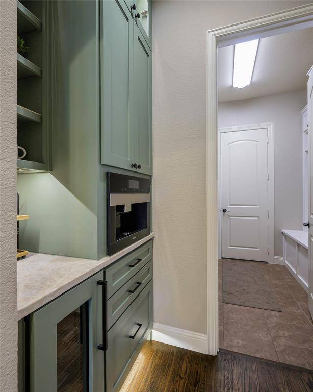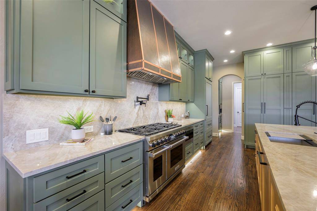 The fully renovated chef's kitchen is the centerpiece of the home, featuring an oversized island, quartzite countertops, high-end appliances (Wolf & Subzero), pot filler, water filtration system, paneled refrigerator, espresso machine, nugget ice machine, beverage refrigerator, quiet-close custom cabinetry, and a hidden walk-in pantry that keeps everything organized.