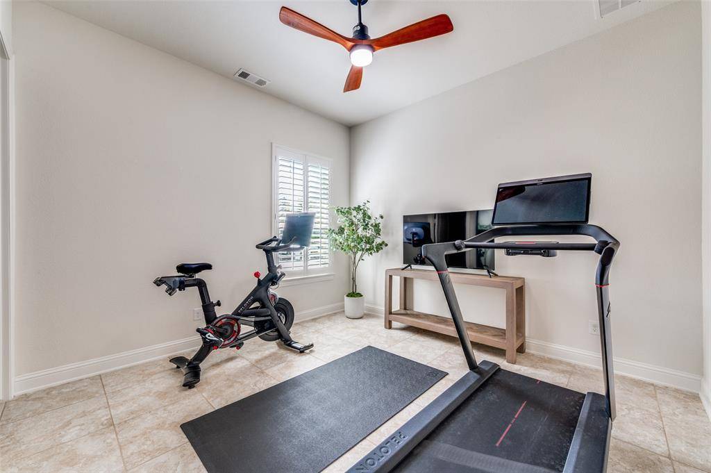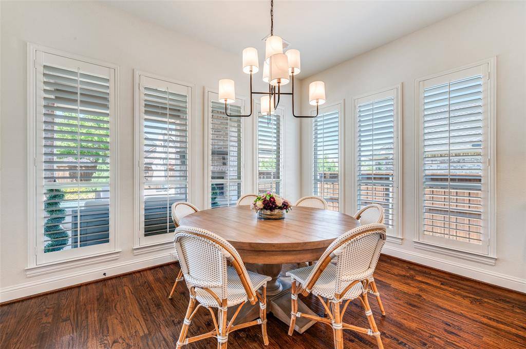 OPEN HOUSE SUNDAY 1:00-3:00. Welcome to Gentle Creek Estates! This stunning 5-bedroom, 5.1-bath Huntington POOL Home, offers gorgeous finishes and a thoughtful design. Step inside to discover soaring ceilings with stately wood beams, hand-scraped hardwood floors, and a dramatic stone fireplace in the family room. The chef's kitchen is an entertainer's dream, featuring dual ovens, a gas cooktop, a huge island, a built-in fridge, and a butler's pantry. Handsome library with built-ins, adjacent to a unique 10x10 rotunda perfect for a home office or music room. The main floor hosts a private and luxurious owner's retreat, plus a guest suite with an ADA-approved ensuite bath for accessibility. Upstairs, the well-designed floor plan includes 3 additional bedrooms with private baths, a game room with a wet bar and mini-fridge, and a large media room. Designed for year-round entertaining, the oversized lot boasts a spectacular 30-foot pavestone patio, an outdoor fireplace, and a sparkling pool, while still offering a generous grassy area. Complete with a mudroom and a 3-car garage, this exceptional property blends elegance and function seamlessly. Zoned for Prosper ISD and Walnut Grove High School
