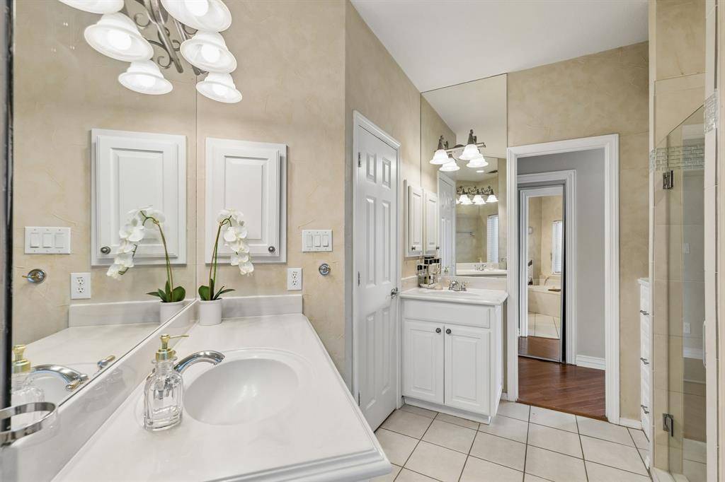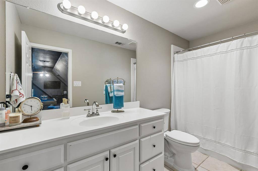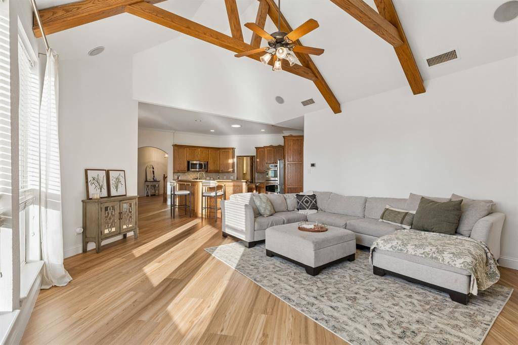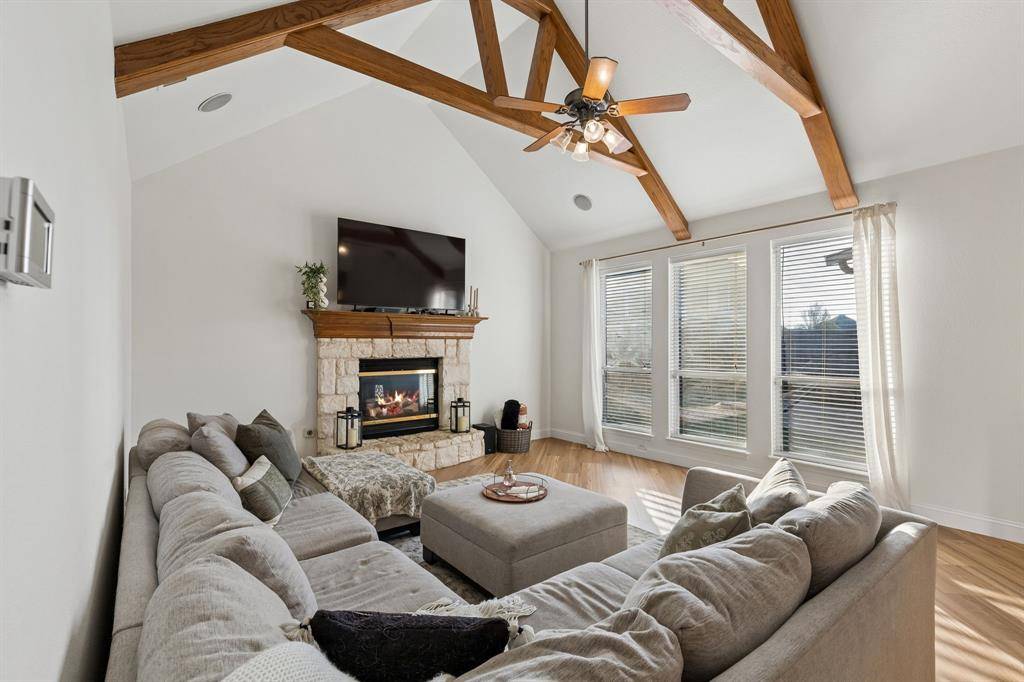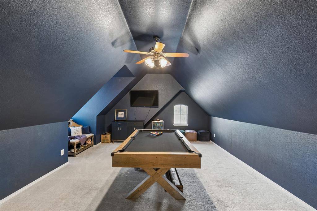 Welcome to your dream home! Set on a spacious corner lot, this stunning property perfectly blends everyday comfort with exceptional entertainment. Fresh landscaping and new irrigation system! Step inside to an inviting open-concept layout with soaring vaulted ceilings, beautiful wooden trusses, and a cozy gas fireplace that fills the space with warmth and light. The chef's kitchen features high-end gas appliances, custom cabinetry, and elegant granite countertops. Brand New LVP Flooring and Fresh Paint throughout! Upstairs, you'll find a versatile game room or media room with its own full bathroom, ideal for entertaining or unwinding. Just off the living area, a large enclosed patio opens to an expansive backyard oasis — complete with a spacious pool with rock waterfalls, a half basketball court, and a relaxing fire pit, perfect for unforgettable gatherings with family and friends.