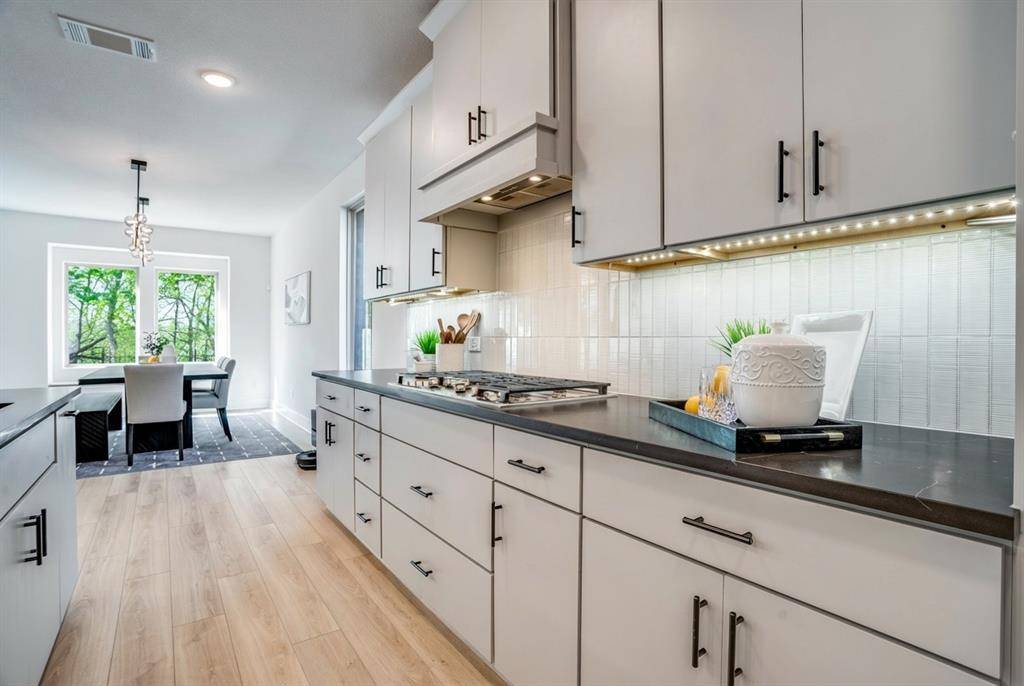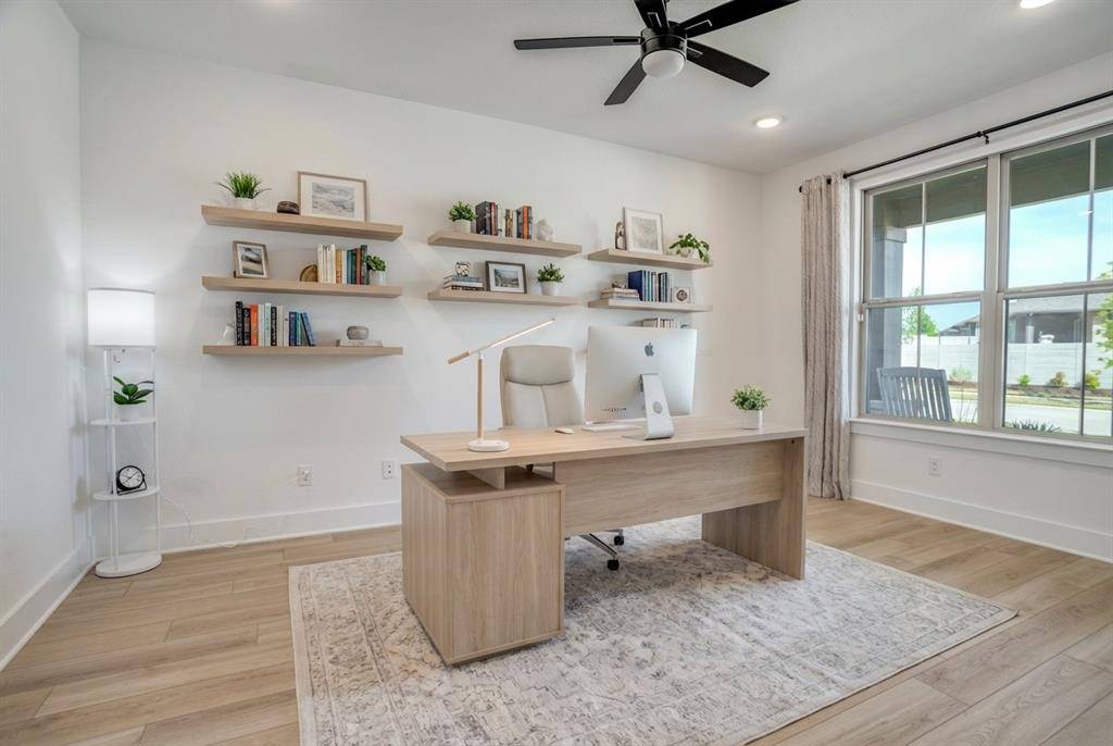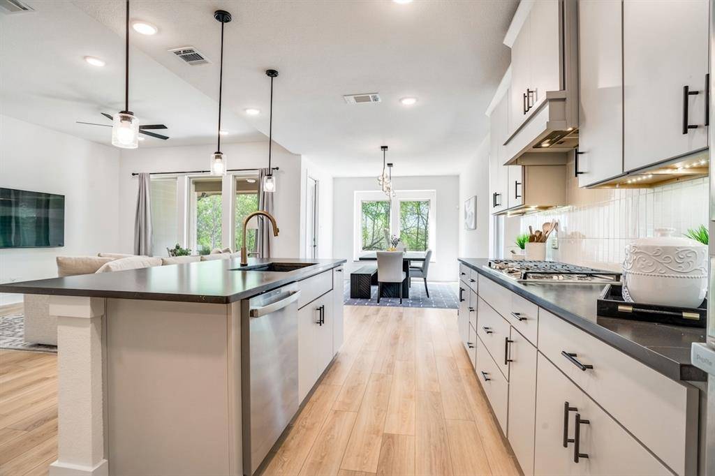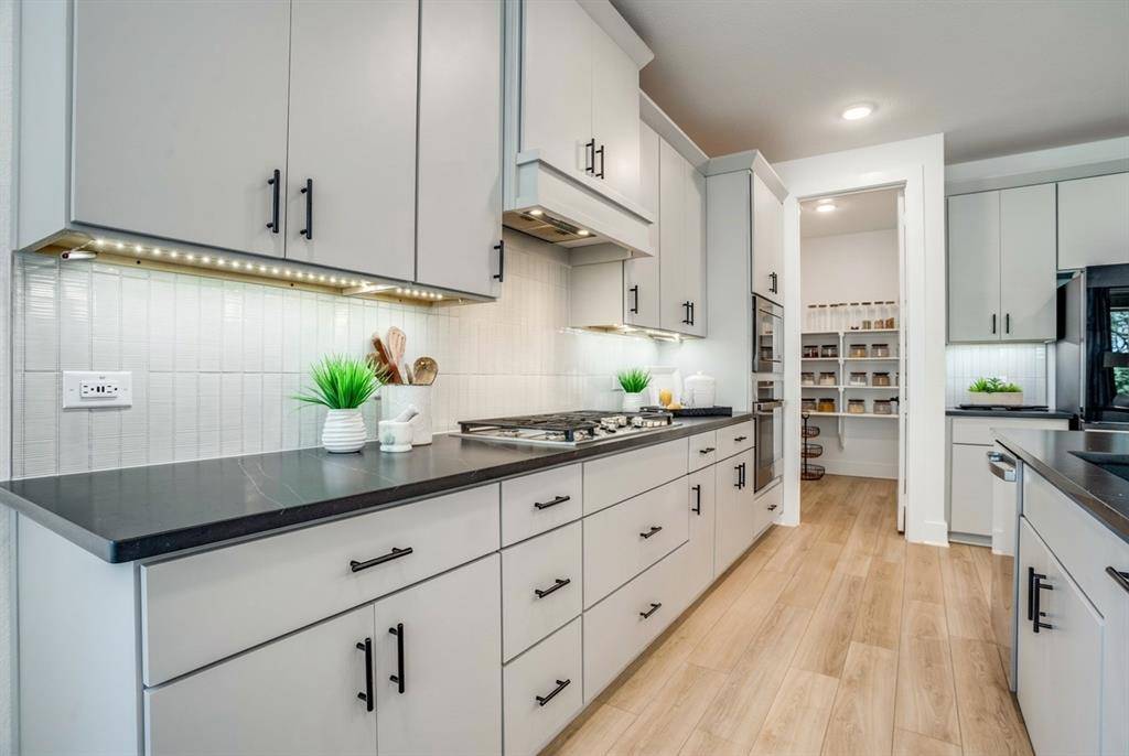 Nestled on a lush greenbelt lot in sought-after Painted Tree, this east-facing home feels better than new, with thoughtful upgrades around every corner. A private office with glass French doors sets the tone. The living room glows with flush-mount LED lighting, flowing seamlessly into a stunning open-concept kitchen featuring marble-look quartz countertops, upgraded cabinetry, champagne bronze fixtures, a large granite composite single-bowl sink, a 5-burner gas cooktop under a Cambridge Wood Hood, and a charming box window in the dining nook. Downstairs also includes a half bath, laundry room, and built-in cubbies right off the garage — because everyday life should be effortless.