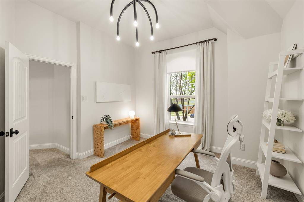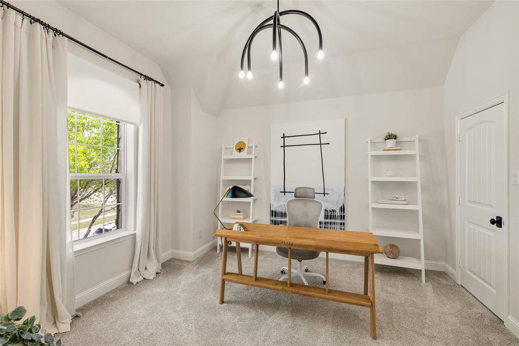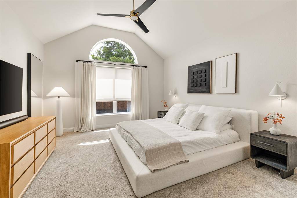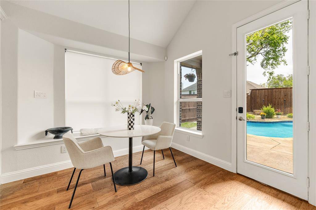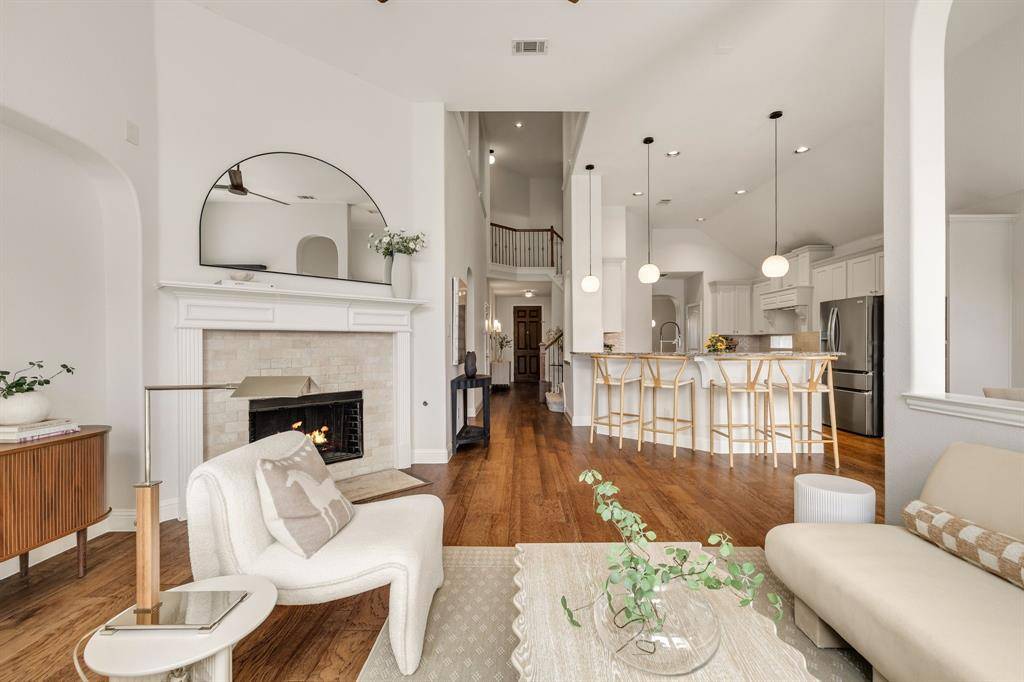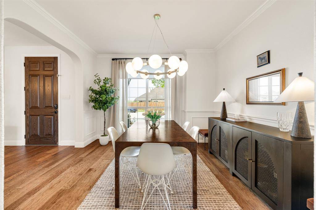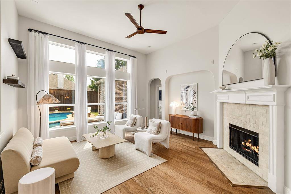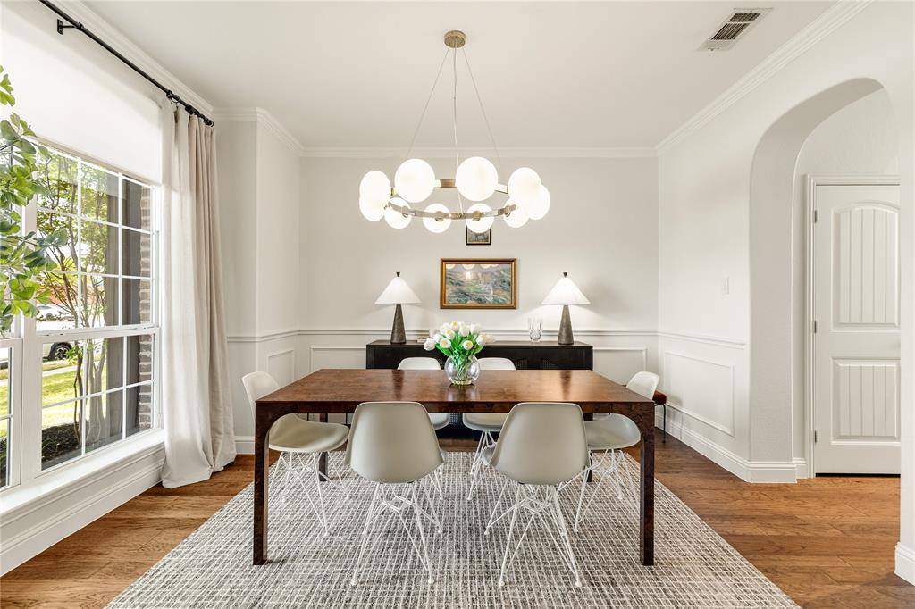 Tucked at the end of a quiet cul-de-sac near the lake, this home offers privacy, space, and a setting that feels both peaceful and inviting. Surrounded by well-maintained landscaping, it makes a strong first impression from the moment you arrive. Step through the front door into a home that feels refined and thoughtfully designed, where clean finishes and natural light set the tone. Fresh Benjamin Moore paint and stylish updated lighting run throughout, giving the home a cohesive, move-in ready feel. Just off the entry, the formal dining room features picture frame molding and a statement chandelier, creating a warm and elevated space for hosting. The main living area opens with a wall of windows overlooking the backyard, filling the space with natural light. A fireplace anchors the room, making it ideal for both everyday living and gathering with friends and family.