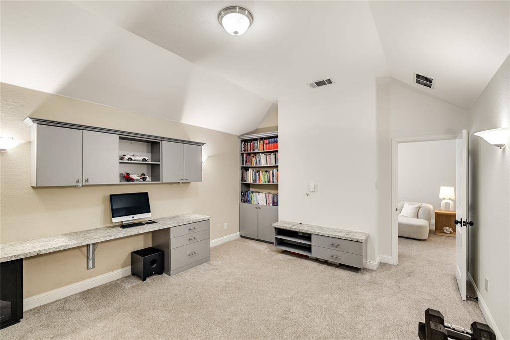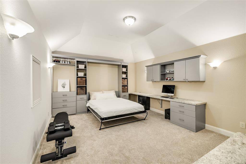 The kitchen is both functional and refined, with granite countertops, shaker-style cabinetry, and a newly installed Italian tile backsplash. It flows seamlessly into the breakfast area and living space, making it the true heart of the home. The first floor includes a private guest suite, while the spacious primary bedroom offers a comfortable retreat with high ceilings, pool views, and a spa-like bath. Upstairs, three generously sized bedrooms provide comfort and flexibility, while the expansive game room and media room, complete with a built-in desk and custom Murphy bed, offer a versatile space for entertaining, working, or hosting overnight guests. Outdoors, the home truly shines. The covered patio overlooks a sparkling pool and spa, creating a peaceful setting for relaxing evenings. A dedicated firepit area invites gathering and connection, making the backyard feel like your own private retreat. Additional highlights include EV charging in the garage, combining modern convenience with everyday functionality.