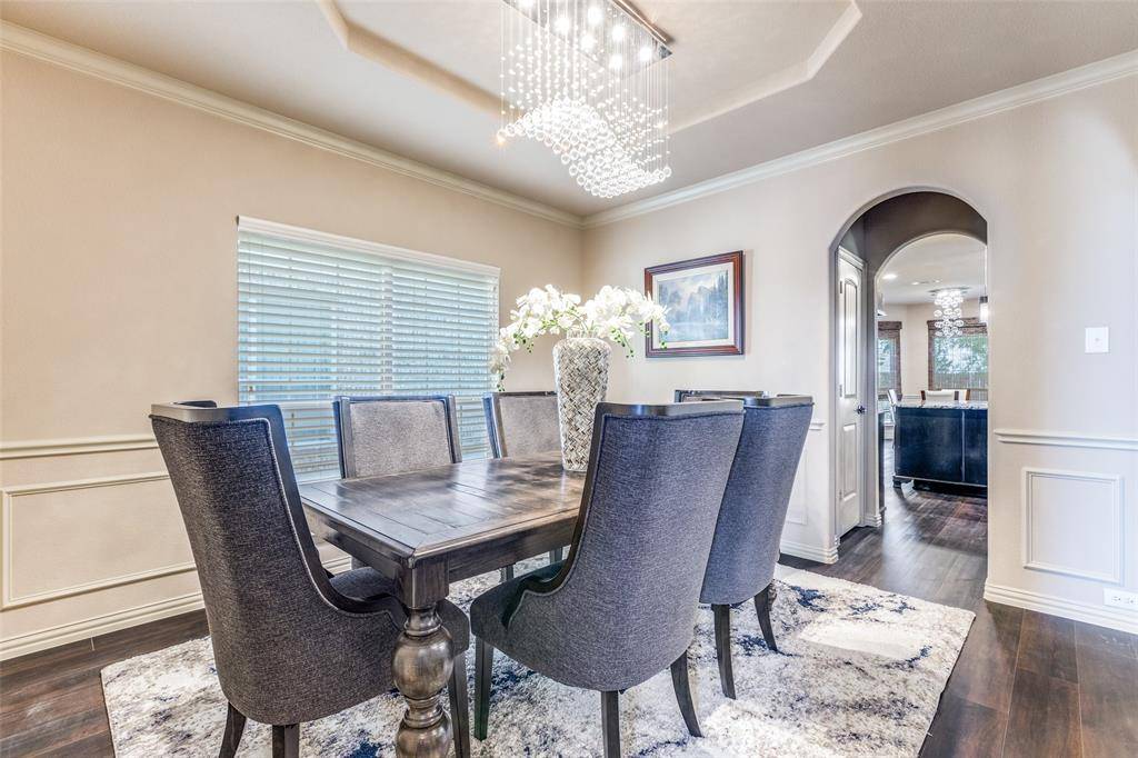 Welcome to this elegant 2-story, 3 car garage home located in Prestwyck between the N Dallas Tollway and 75 Central Expressway in the highly sought-after Prosper ISD, walking distance to Prestwyck Park and Elementary! This stunning 5-bedroom, 4-bath residence features luxury lighting-complemented by vaulted ceilings, a gas fireplace, and a dedicated theater room. Enjoy having your office space downstairs. This house has it all-Wrought iron banisters, crown molding, plantation shutters, and impressive dark wood finishes. The gourmet kitchen boasts granite countertops, a large island, double ovens, 42-inch cabinets, a stylish stone backsplash, and a butler's pantry.