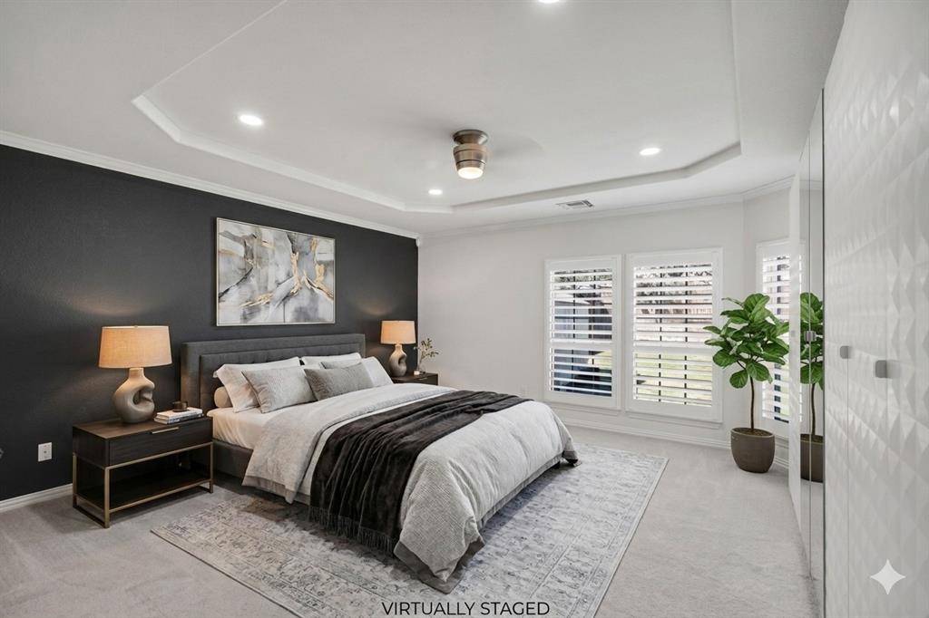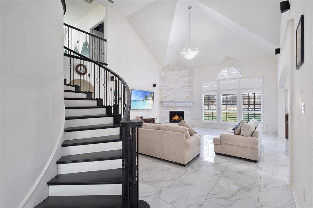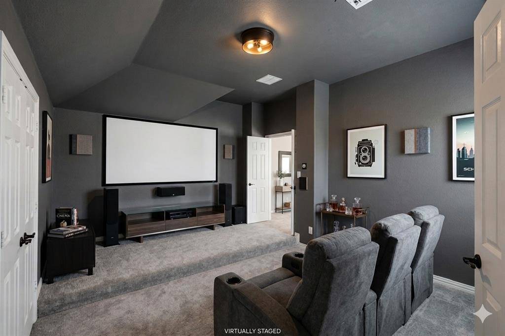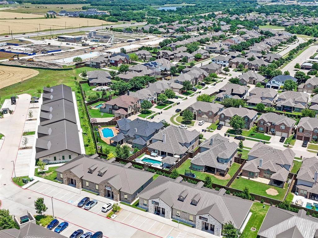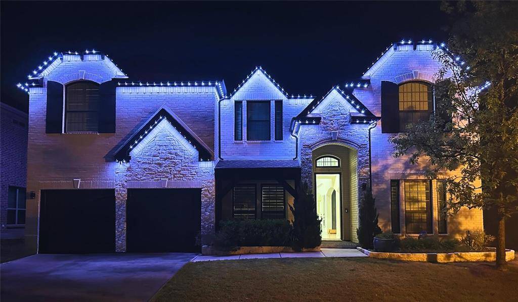 Gorgeous, updated home on an east-facing, north corner lot in the highly desirable Prosper ISD. Live the life you've always dreamed in this move-in-ready residence featuring impressive architectural details and thoughtful upgrades throughout. The main level welcomes you with oversized porcelain tile floors, soaring ceilings, and a stunning curved stairway with wood treads. The family room is highlighted by a dramatic floor-to-ceiling fireplace and wall of beautiful windows.A true Chef's kitchen awaits, featuring quartz countertops, a latest design gas cooktop, motion-sensor vent hood, convection oven, and a ceramic sink. Retreat to the master suite, which offers a private sitting area, dual sinks, a soaking tub, and a spacious walk-in closet. Upstairs, entertain in the expansive gameroom or enjoy a movie in the dedicated media room (equipment included!). Four additional oversized bedrooms and two full baths complete the second floor.The private backyard is an outdoor oasis with a covered back patio, upgraded privacy fence, and a storage building that stays with the property. Custom JellyFish exterior lighting creates the perfect evening ambiance. Located just steps from Prestwyck Park, the community pool, and walking trails, with quick access to Rock Hill High and top-tier dining and entertainment. This is a must-see!