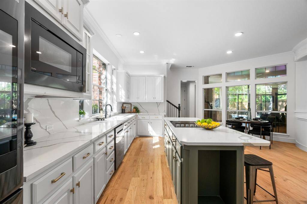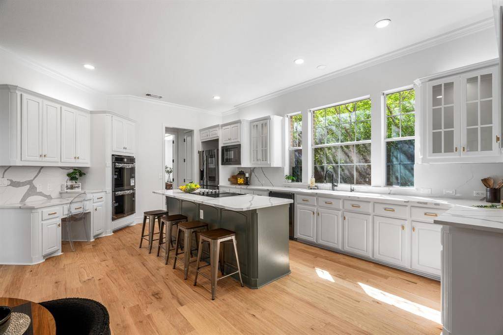 The chef's kitchen is a true showpiece—quartz countertops and backsplash, a sleek downdraft cooktop, new black stainless appliances, and custom-built cabinetry make it as functional as it is breathtaking.