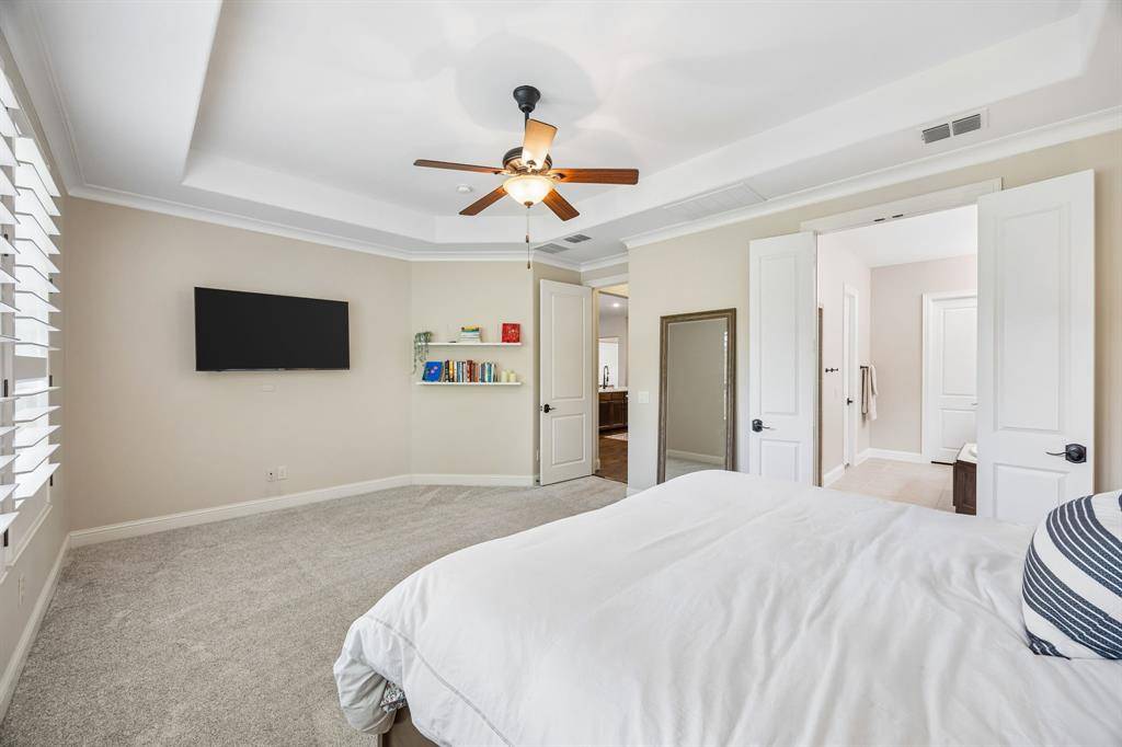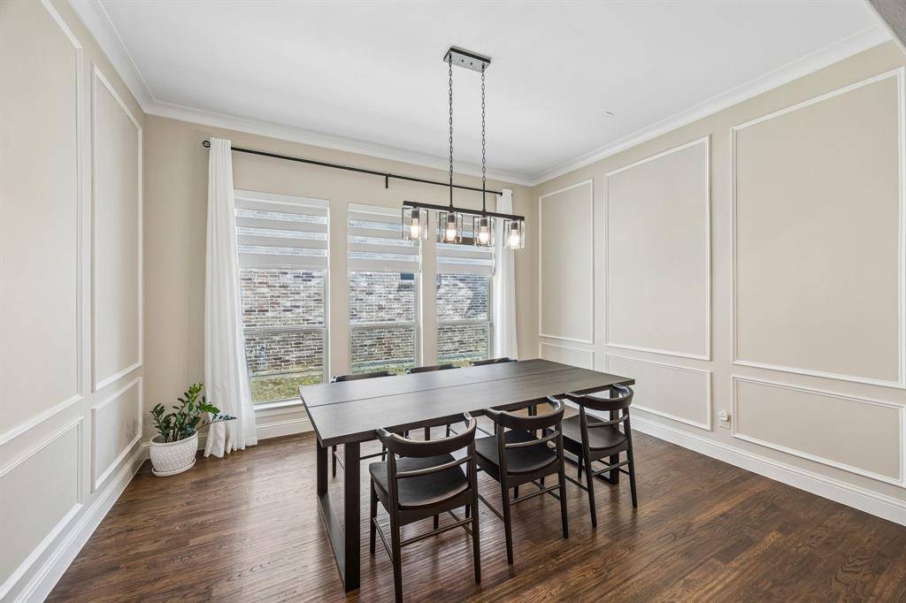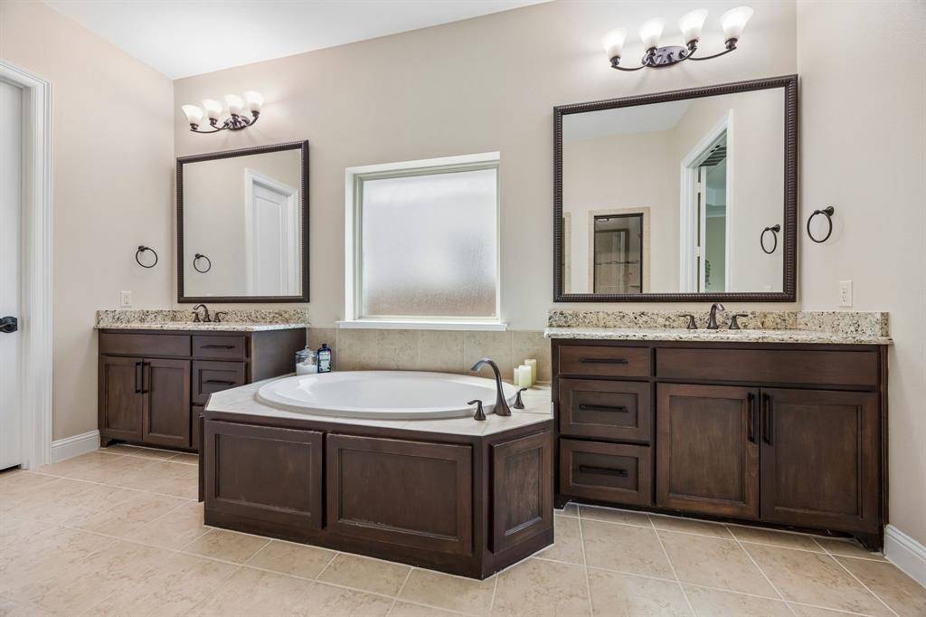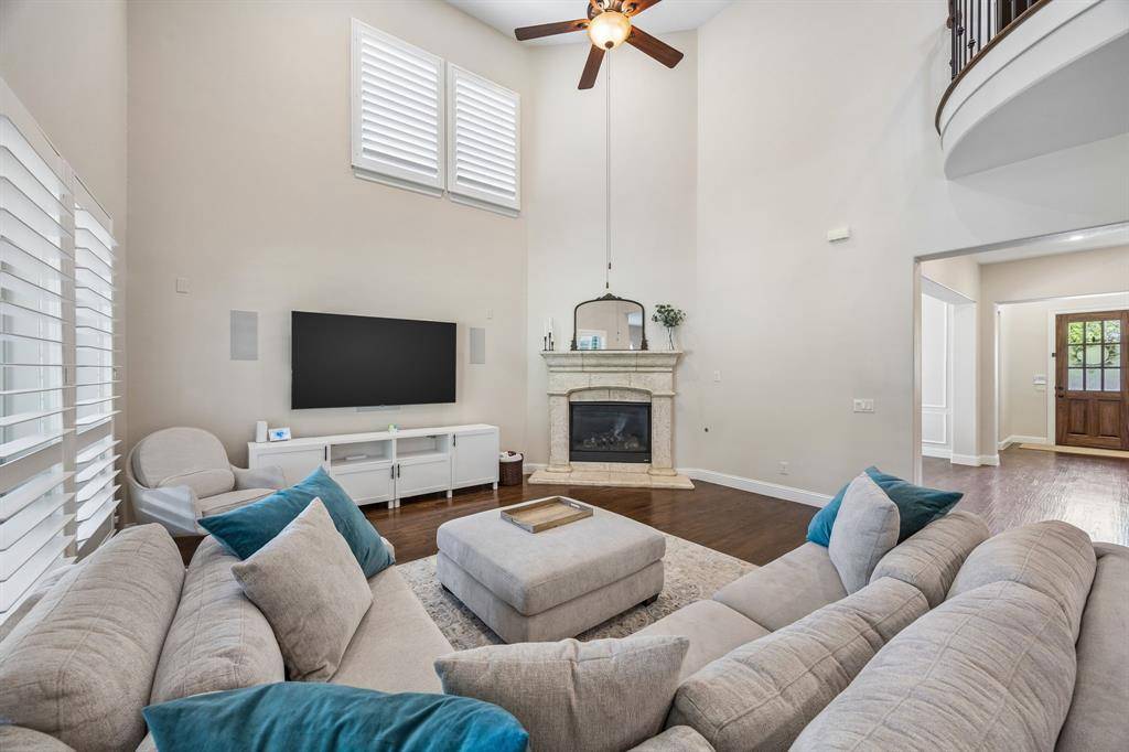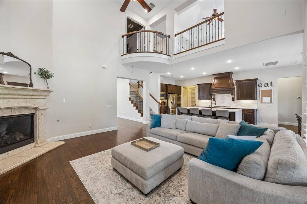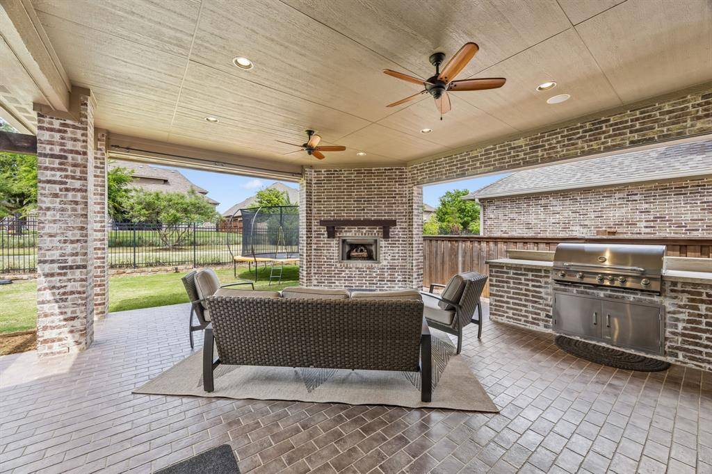 A striking blend of timeless architecture and modern livability, this beautifully appointed home welcomes you with exceptional curb appeal, featuring a classic brick and stone façade, manicured landscaping, and a spacious 3-car garage. Step inside to discover rich hardwood flooring, soaring ceilings, and an open, light-filled layout designed for both everyday comfort and elegant entertaining. The inviting formal dining space is perfectly positioned at the front of the home, framed by large windows and designer lighting, creating an ideal setting for hosting. At the heart of the home, the gourmet kitchen impresses with an oversized quartz island, sleek stainless steel appliances, double ovens, custom cabinetry, and a statement vent hood—all opening to a spacious family room. This space is anchored by a stunning fireplace and enhanced by dramatic ceiling heights and walls of windows, flooding the home with natural light. The private primary suite serves as a serene retreat, featuring a tray ceiling and a spa-inspired bath complete with dual vanities, a soaking tub, and a separate walk-in shower. A sophisticated and versatile home office offers the perfect balance of productivity and comfort. Main floor guest bed. The spacious game room offers a bright and inviting secondary living area, ideal for relaxing or entertaining. With ample room for a lounge setup, play area, this flexible space adapts to any lifestyle. Elevate your entertainment experience in your dedicated media room. The expansive covered patio is designed for year-round enjoyment, featuring a built-in outdoor kitchen with grill, a cozy fireplace, and multiple seating areas—all overlooking a beautifully maintained yard with peaceful greenbelt views and no immediate rear neighbors. Whether hosting guests or enjoying quiet evenings, this outdoor space delivers the ultimate in Texas living.