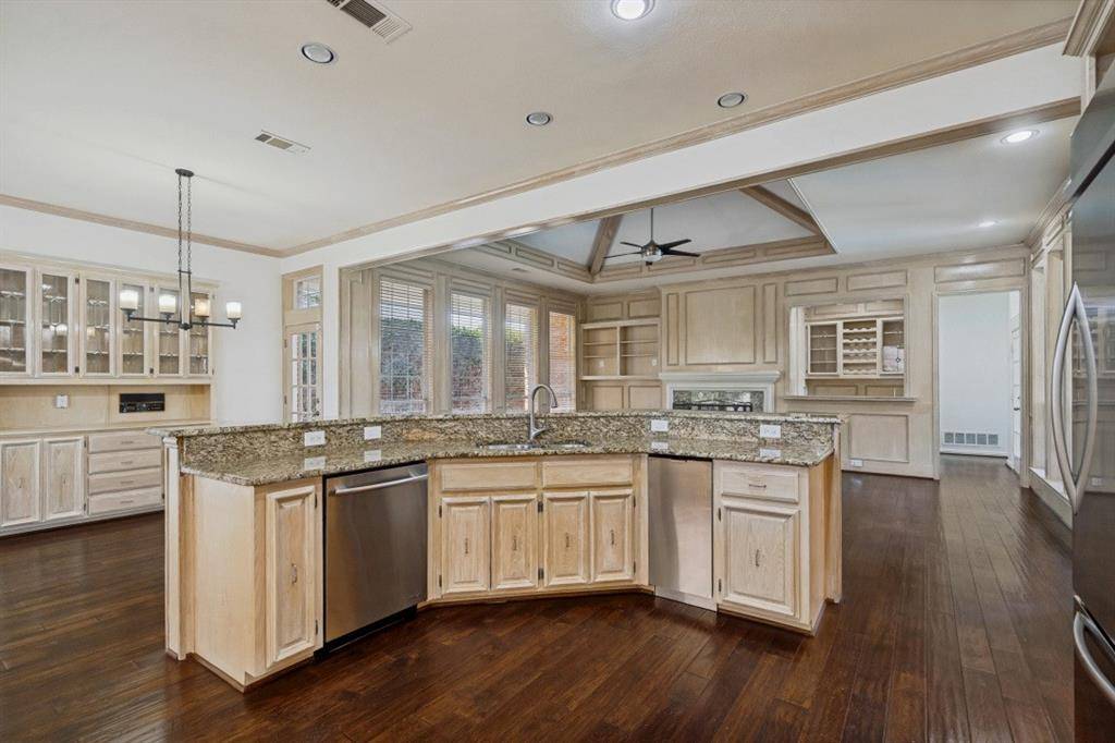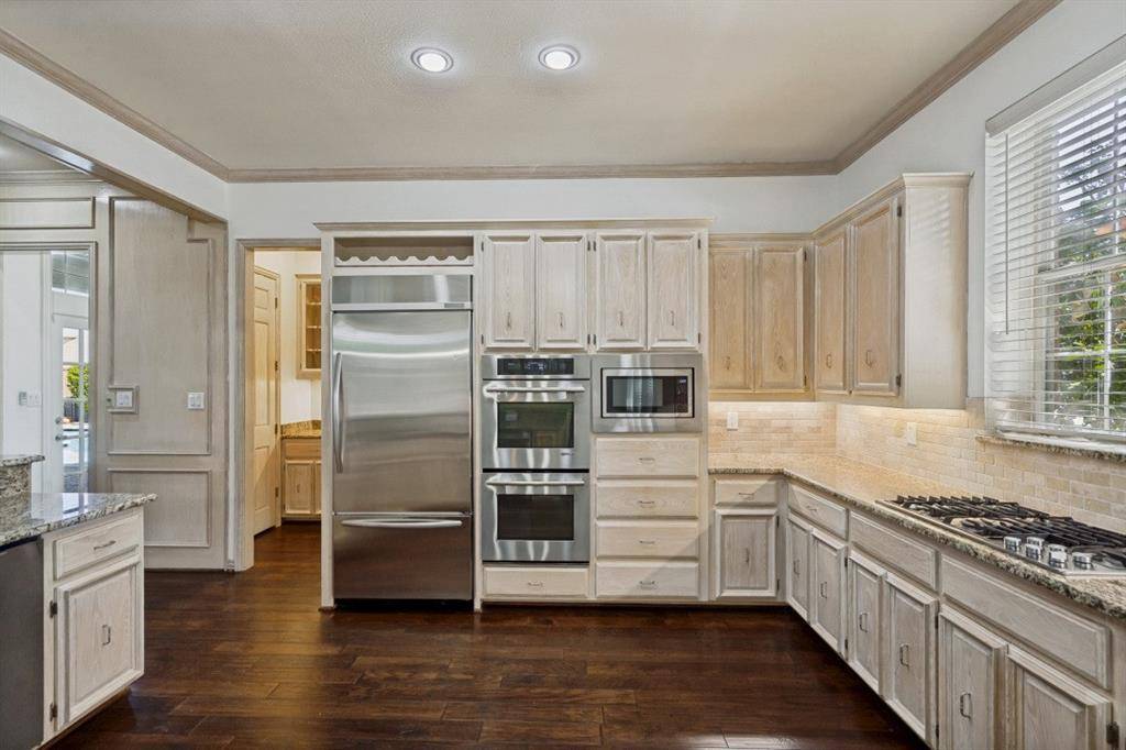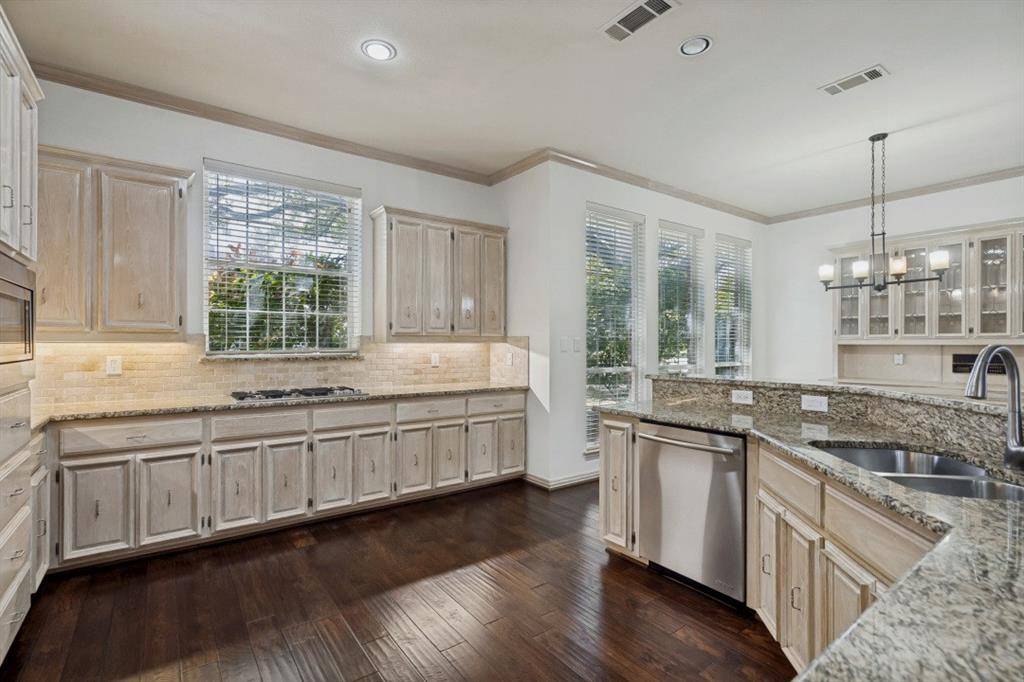 Welcome to this stunning executive home in the highly sought-after Harrington Homeplace, located in top-rated Plano ISD. Perfectly positioned in the heart of West Plano, this custom residence offers the ideal blend of luxury, functionality, and everyday comfort. This beautifully designed 5-bedroom home features a dramatic entry, an open floor plan, and abundant natural light throughout. Rich hardwood floors, two fireplaces, and a wet bar create an inviting atmosphere for both relaxing and entertaining. The gourmet kitchen is the heart of the home, complete with granite countertops, a 5 burner gas cooktop, double ovens, built-in refrigerator, under-mount sink, extensive cabinetry, a built-in hutch, and a butler's pantry. It opens seamlessly to the main living areas, making it perfect for hosting gatherings or enjoying time with family. The thoughtfully designed layout includes three bedrooms downstairs, offering flexibility for guests or multigenerational living. Split formals and an oversized dining room provide elegant spaces for entertaining.
