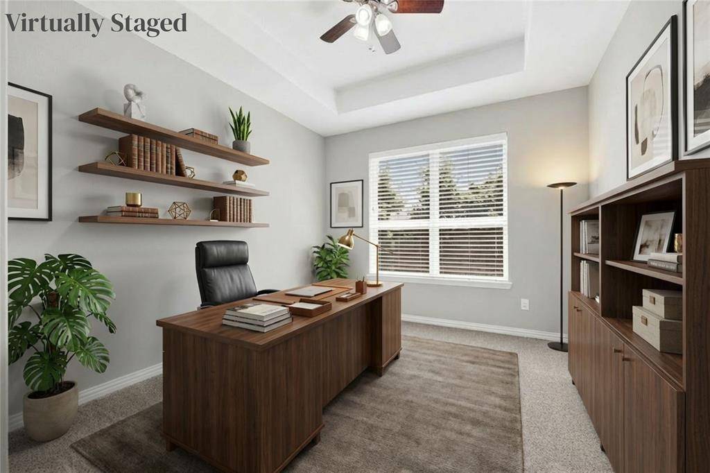 The primary suite is generously sized and offers a luxurious bathroom with a glass-enclosed shower, walk-in closet, and a built-in desk vanity. A dedicated home office with double doors, tray ceilings, and crown molding throughout the home adds both functionality and sophistication.