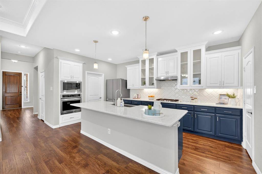 The heart of the home is the chef's kitchen, complete with quartz countertops, glass-front cabinetry, a gas cooktop, and a recently replaced microwave—perfectly flowing into the spacious living room with tray ceilings and the elegant dining area with a statement chandelier.