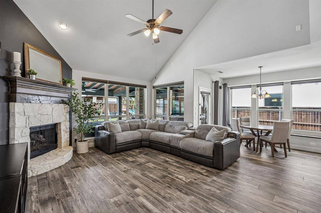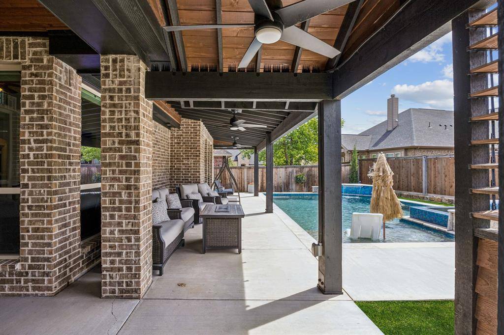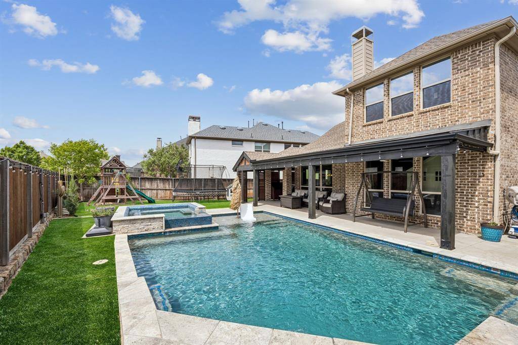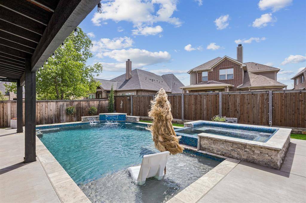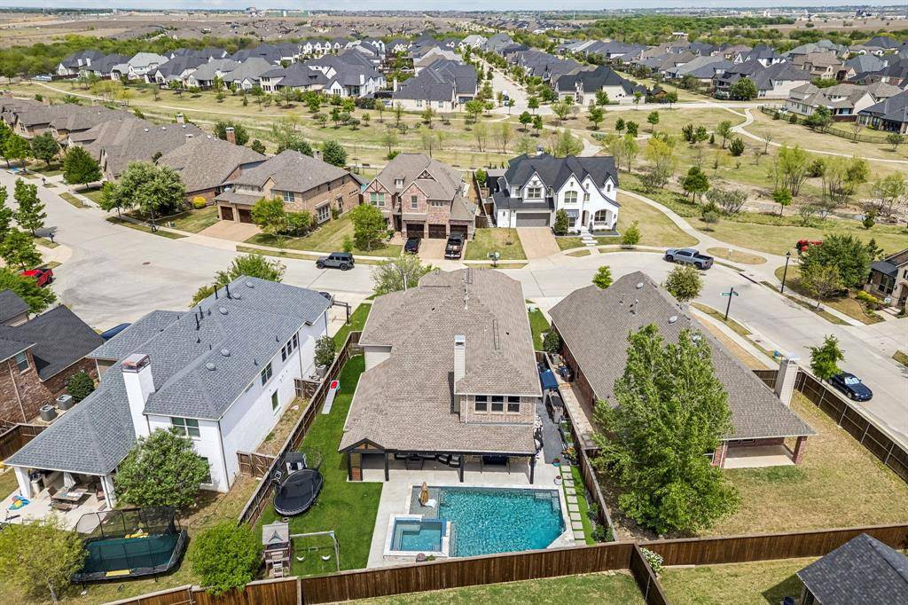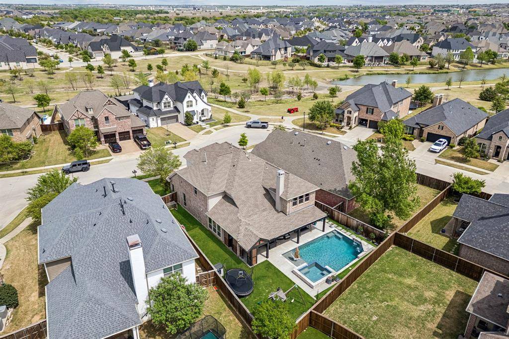 Set within one of the most sought-after master-planned communities in the North Dallas suburbs and zoned to highly rated Prosper ISD, this home has a presence you feel the moment you walk in. Impeccably maintained and thoughtfully laid out, it offers open kitchen and living spaces, five true bedrooms, plus a game room and media room that give everyone room to spread out while still staying connected. A sweeping curved staircase creates a striking first impression and sets the tone for what's to come. The kitchen is both functional and beautiful with rich knotty alder cabinetry, abundant storage, a walk-in pantry, thick granite countertops, and a gas cooktop, along with a butler's pantry that seamlessly connects to the formal dining room for easy hosting. Updated wood-look ceramic tile runs throughout the majority of the first floor, and a stone fireplace brings a warm, grounded focal point to the living area. Natural light pulls your eye straight to the backyard, with incredible views of the pool and spa from the kitchen, living area, and primary suite, while a spacious covered patio and turf create a backyard that feels like your own private escape. Positioned directly across from one of the most beautiful trail systems in the neighborhood, you're surrounded by resort-style amenities including pools, a full fitness center, stocked fishing ponds, sport courts, lakes, parks, playgrounds, a neighborhood restaurant, and golf cart access to Frontier Park, local coffee spots, and more. Front yard maintenance is covered by the HOA, and throughout the year the community comes alive with events like concerts at the Barn Yard, a true neighborhood favorite. A new roof will be installed prior to closing, adding even more value and peace of mind. The kind of place where neighbors become lifelong friends and every day feels a little more fun.
