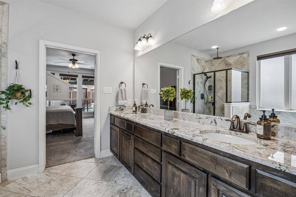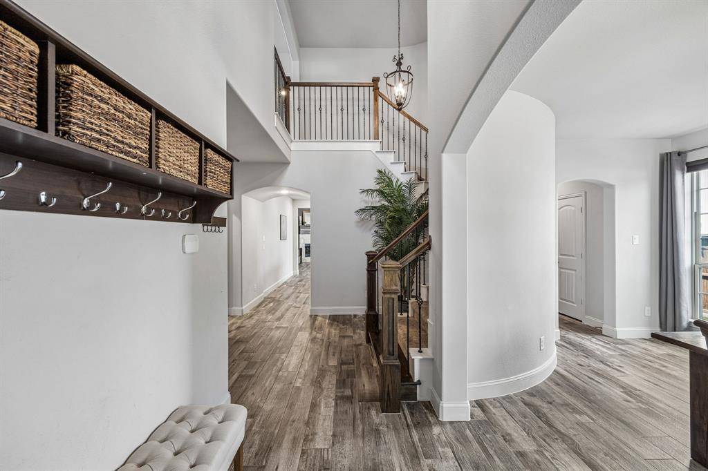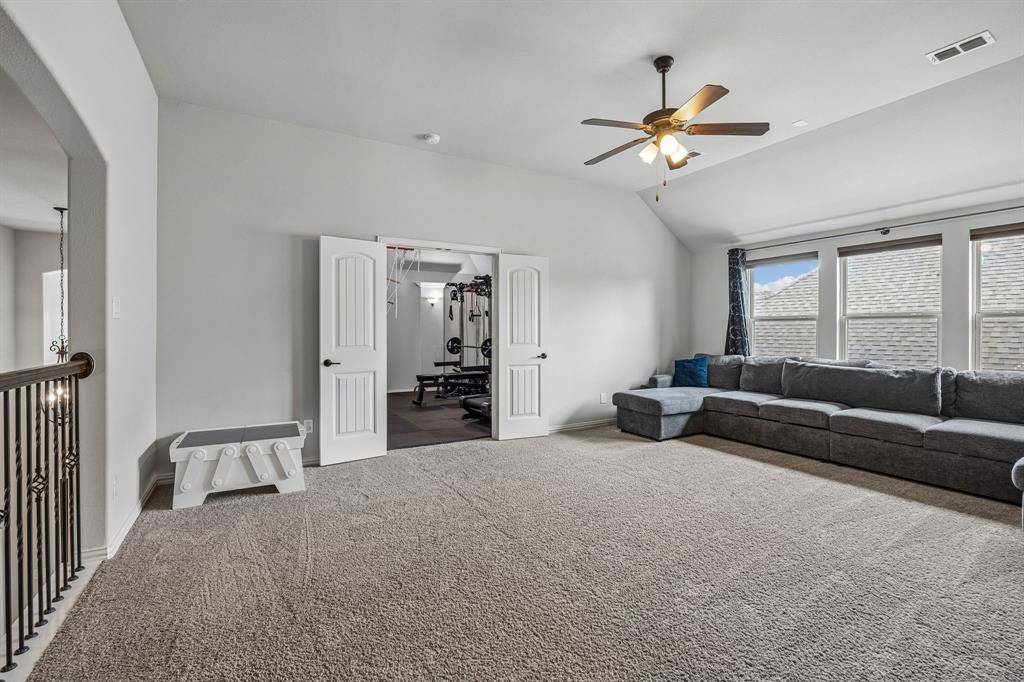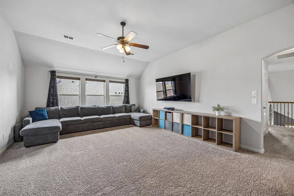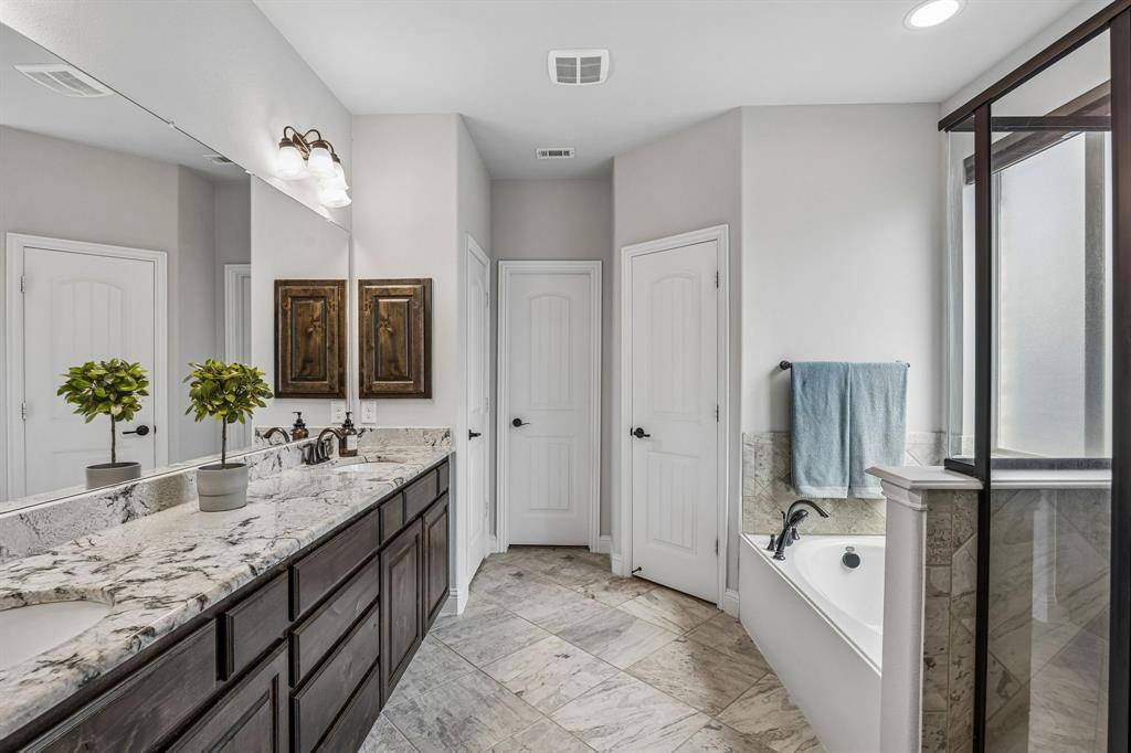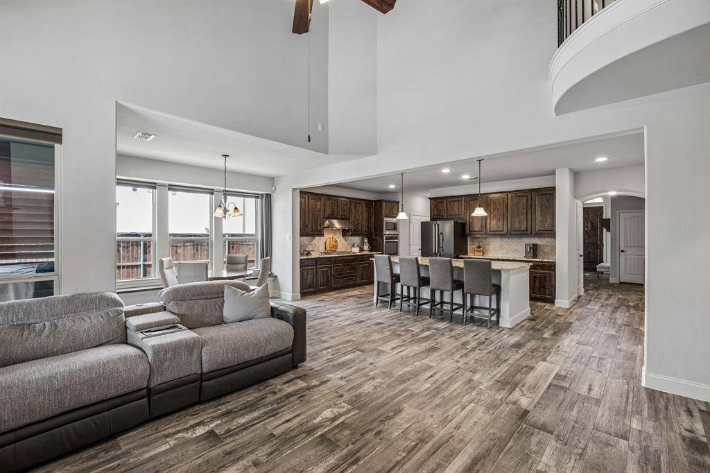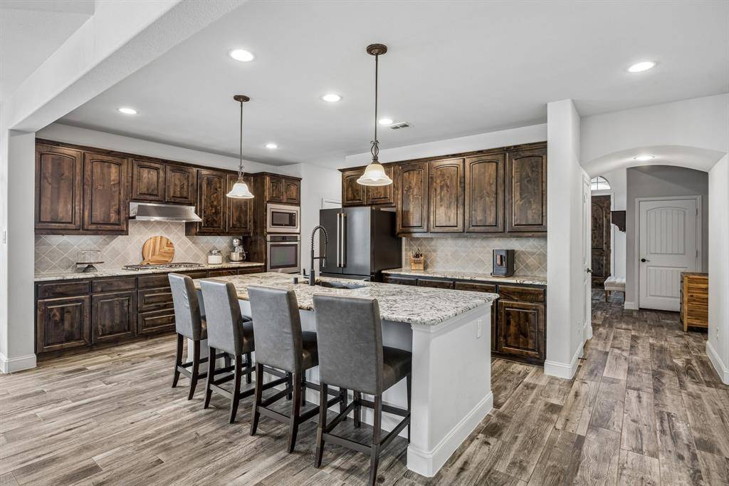 Set within one of the most sought-after master-planned communities in the North Dallas suburbs and zoned to highly rated Prosper ISD, this home has a presence you feel the moment you walk in. Impeccably maintained and thoughtfully laid out, it offers open kitchen and living spaces, five true bedrooms, plus a game room and media room that give everyone room to spread out while still staying connected. A sweeping curved staircase creates a striking first impression and sets the tone for what's to come. The kitchen is both functional and beautiful with rich knotty alder cabinetry, abundant storage, a walk-in pantry, thick granite countertops, and a gas cooktop, along with a butler's pantry that seamlessly connects to the formal dining room for easy hosting. Updated wood-look ceramic tile runs throughout the majority of the first floor, and a stone fireplace brings a warm, grounded focal point to the living area. Natural light pulls your eye straight to the backyard, with incredible views of the pool and spa from the kitchen, living area, and primary suite, while a spacious covered patio and turf create a backyard that feels like your own private escape. Positioned directly across from one of the most beautiful trail systems in the neighborhood, you're surrounded by resort-style amenities including pools, a full fitness center, stocked fishing ponds, sport courts, lakes, parks, playgrounds, a neighborhood restaurant, and golf cart access to Frontier Park, local coffee spots, and more. Front yard maintenance is covered by the HOA, and throughout the year the community comes alive with events like concerts at the Barn Yard, a true neighborhood favorite. A new roof will be installed prior to closing, adding even more value and peace of mind. The kind of place where neighbors become lifelong friends and every day feels a little more fun.