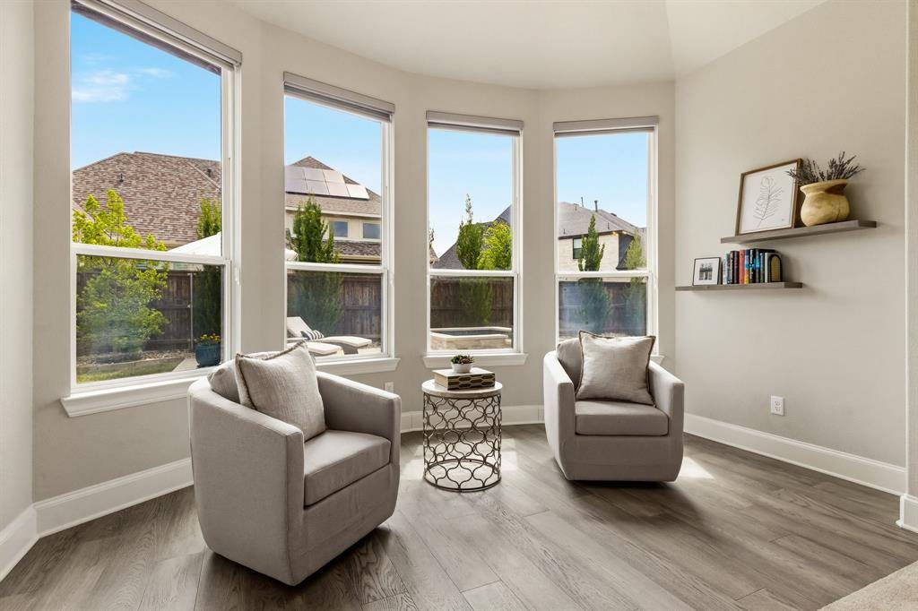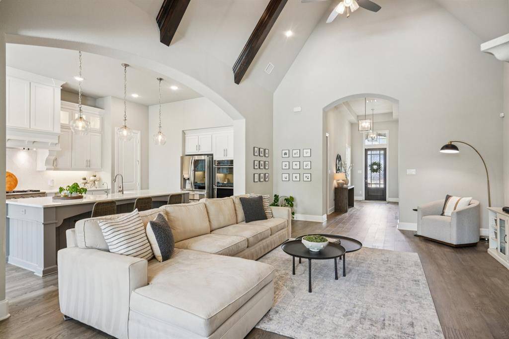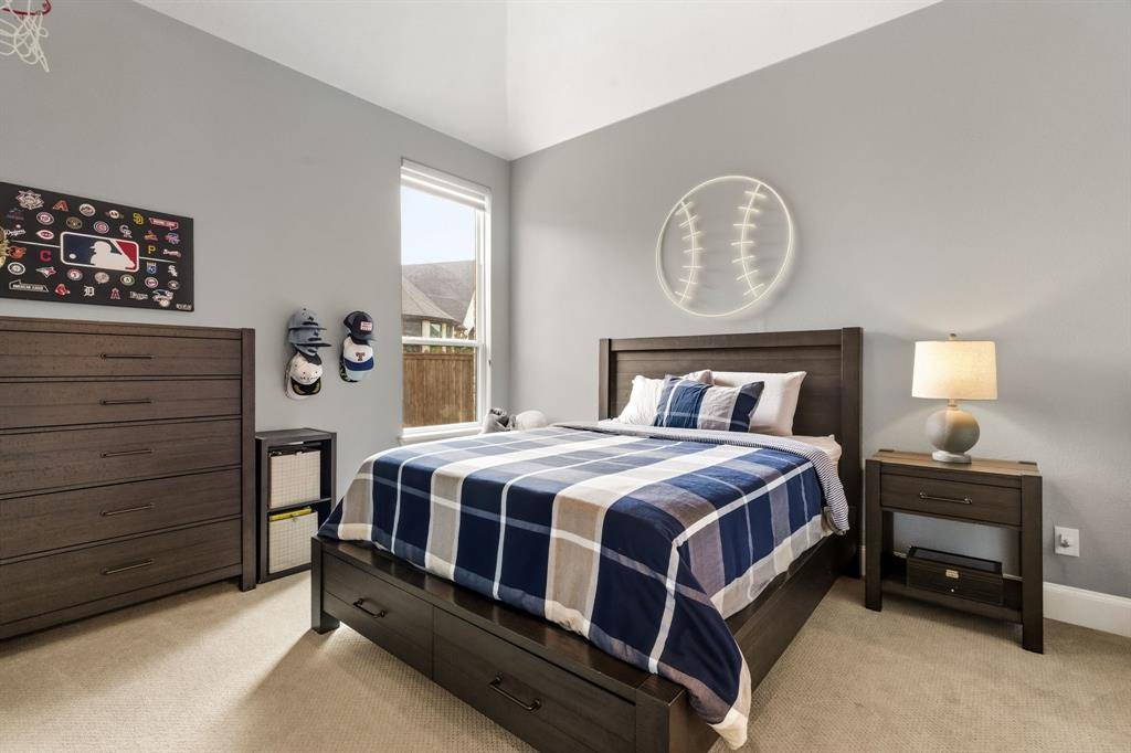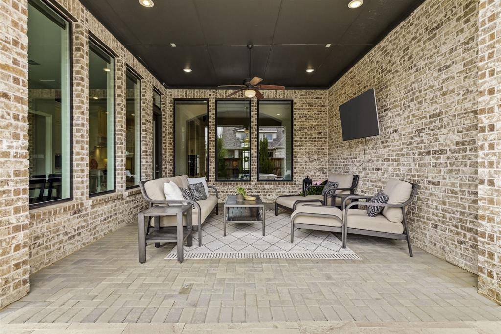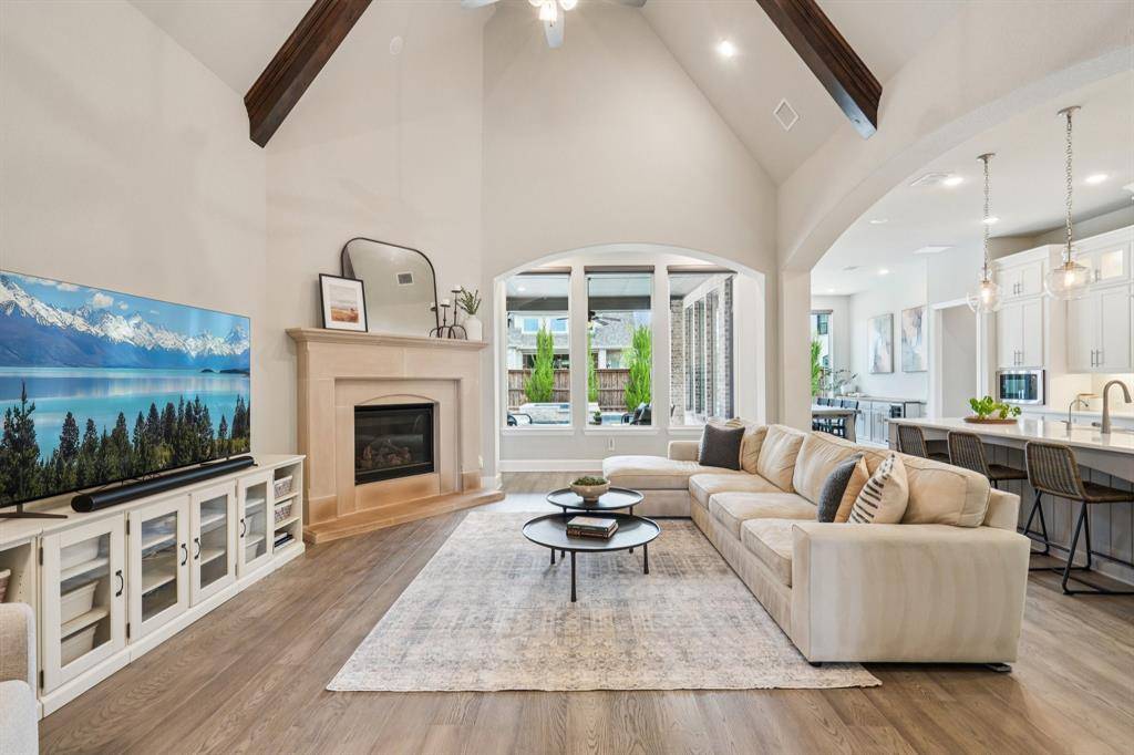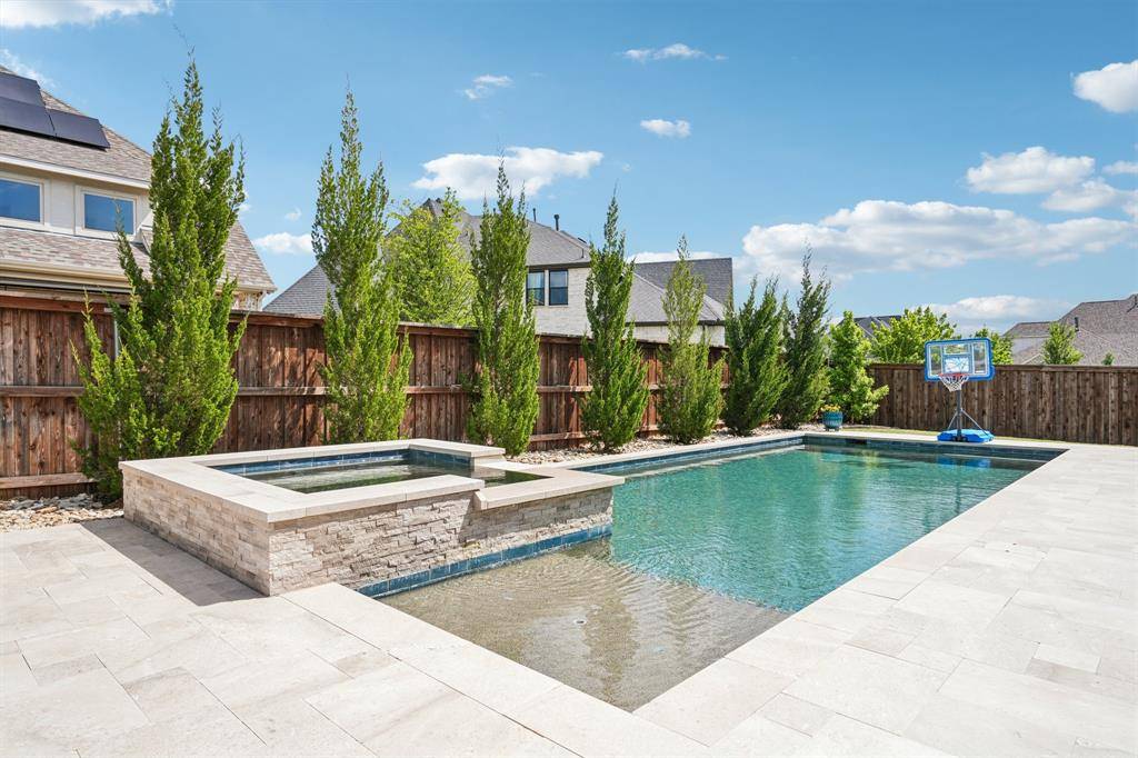 A rare, true one-of-one floor plan by Highland Homes in the highly sought after Edgestone community. This single story design blends thoughtful architecture with a light, breezy aesthetic reminiscent of a refined Pottery Barn style. Offering 4 spacious bedrooms, each with its own en suite bath, the layout is both functional and elevated. The private study features wood beams and soaring ceilings, while the expansive living room is anchored by 19 foot ceilings with exposed beams and seamless flow into the chef's kitchen. Designed for both everyday living and entertaining, the kitchen showcases custom painted Shaker cabinetry, Quartzite countertops, farmhouse sink, built-in refrigerator, 6 burner gas cooktop, double ovens, and an oversized island. Natural light pours into the large dining space, enhanced by built-ins and wraparound windows that create a warm and inviting atmosphere. The primary suite is a true retreat, complete with a bay window sitting area, dual vanities, freestanding soaking tub, oversized walk-in shower, and a generous closet. A flexible bonus space offers the perfect setup for a kids' study area, lounge, or playroom. A dedicated media room adds another layer of functionality for entertaining and everyday enjoyment. All bathrooms are upgraded with Quartzite surfaces, and three secondary suites feature walk-in showers. Step outside to a beautifully designed backyard with a new pool and spa by Riverbend, finished in travertine tile. The covered patio is equipped with a gas line for grilling, creating an ideal setting for outdoor living. An oversized 3+ car garage includes a water softening system and ceiling mounted hanging storage that conveys with the home. Extensive upgrades throughout include wood flooring, designer lighting, and carefully curated finishes. This home truly has it all in a coveted one story, move-in ready and located close to everything Frisco has to offer.