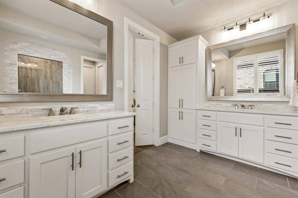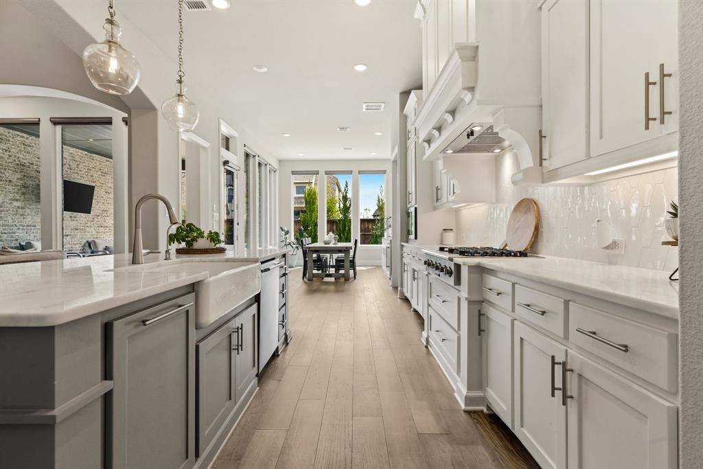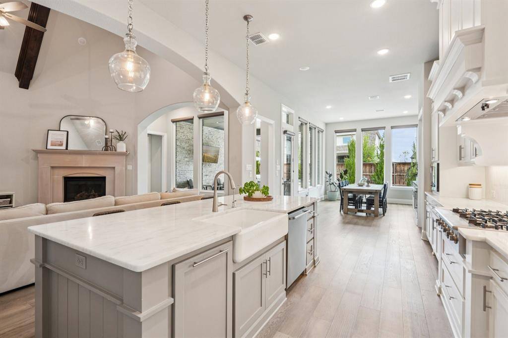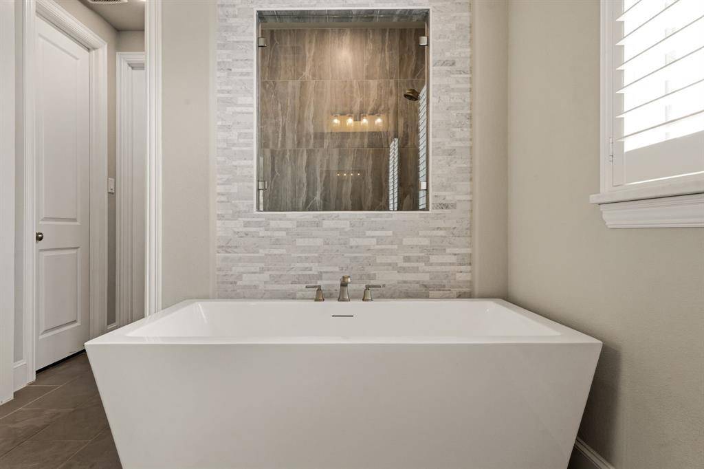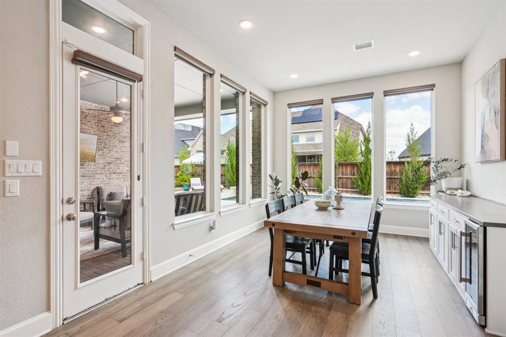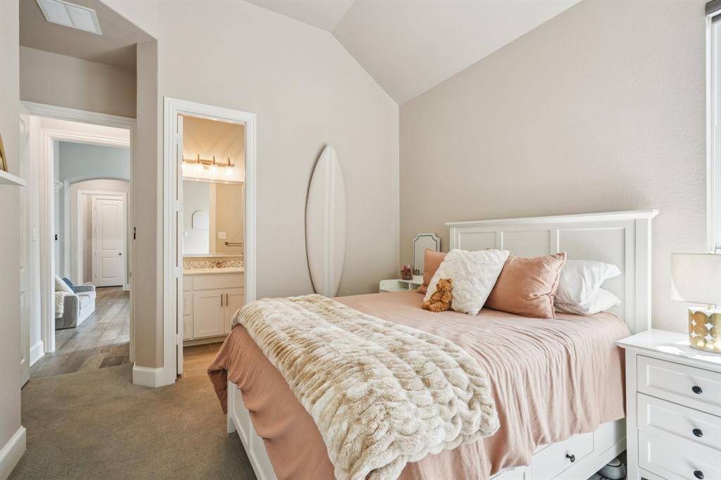 A rare, true one-of-one floor plan by Highland Homes in the highly sought after Edgestone community. This single story design blends thoughtful architecture with a light, breezy aesthetic reminiscent of a refined Pottery Barn style. Offering 4 spacious bedrooms, each with its own en suite bath, the layout is both functional and elevated. The private study features wood beams and soaring ceilings, while the expansive living room is anchored by 19 foot ceilings with exposed beams and seamless flow into the chef's kitchen. Designed for both everyday living and entertaining, the kitchen showcases custom painted Shaker cabinetry, Quartzite countertops, farmhouse sink, built-in refrigerator, 6 burner gas cooktop, double ovens, and an oversized island. Natural light pours into the large dining space, enhanced by built-ins and wraparound windows that create a warm and inviting atmosphere. The primary suite is a true retreat, complete with a bay window sitting area, dual vanities, freestanding soaking tub, oversized walk-in shower, and a generous closet. A flexible bonus space offers the perfect setup for a kids' study area, lounge, or playroom. A dedicated media room adds another layer of functionality for entertaining and everyday enjoyment. All bathrooms are upgraded with Quartzite surfaces, and three secondary suites feature walk-in showers. Step outside to a beautifully designed backyard with a new pool and spa by Riverbend, finished in travertine tile. The covered patio is equipped with a gas line for grilling, creating an ideal setting for outdoor living. An oversized 3+ car garage includes a water softening system and ceiling mounted hanging storage that conveys with the home. Extensive upgrades throughout include wood flooring, designer lighting, and carefully curated finishes. This home truly has it all in a coveted one story, move-in ready and located close to everything Frisco has to offer.
