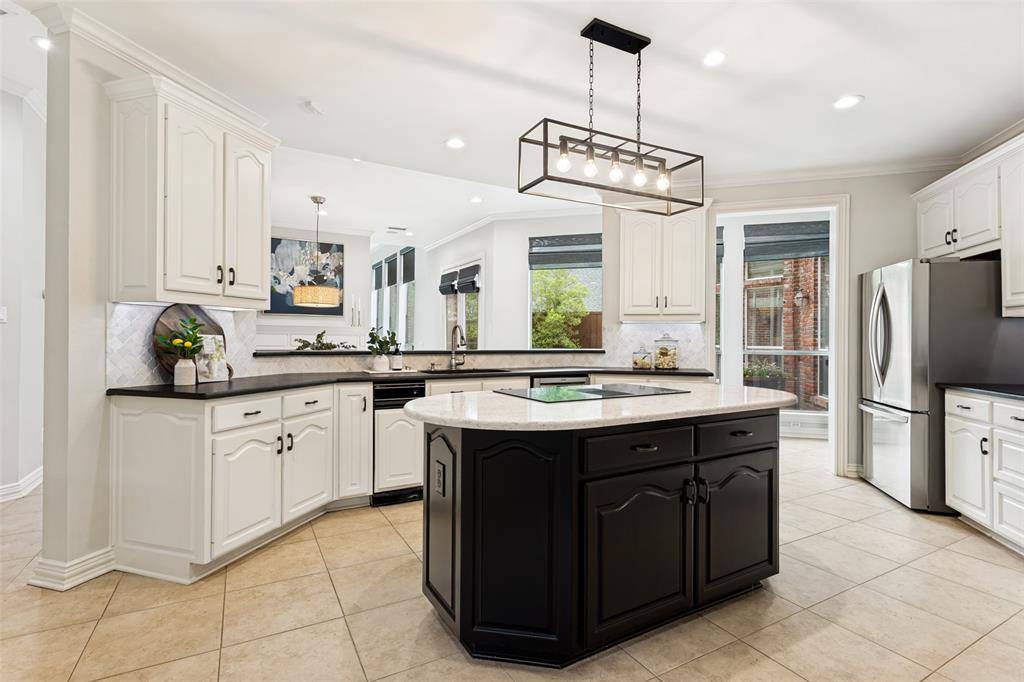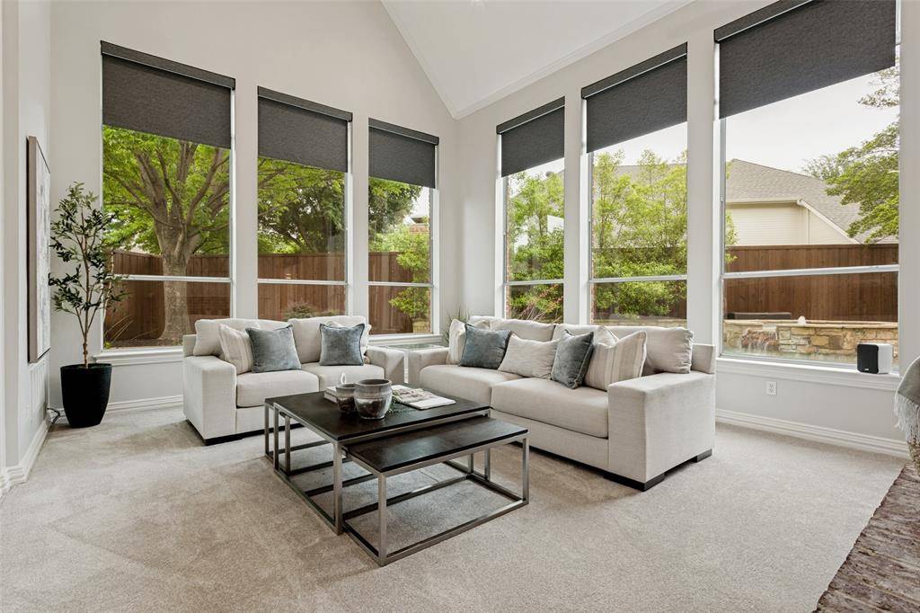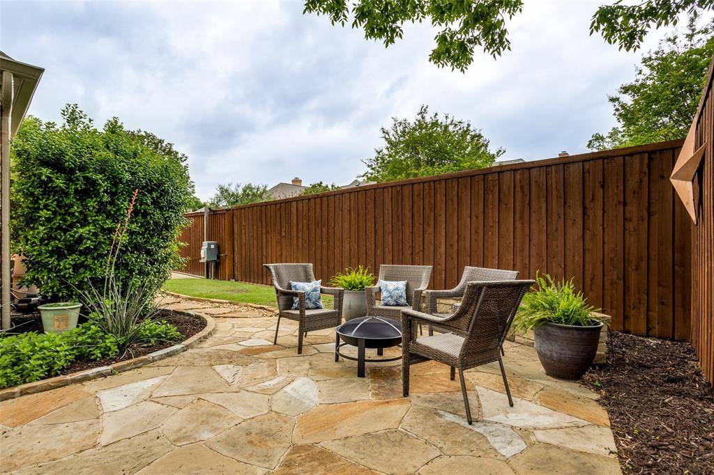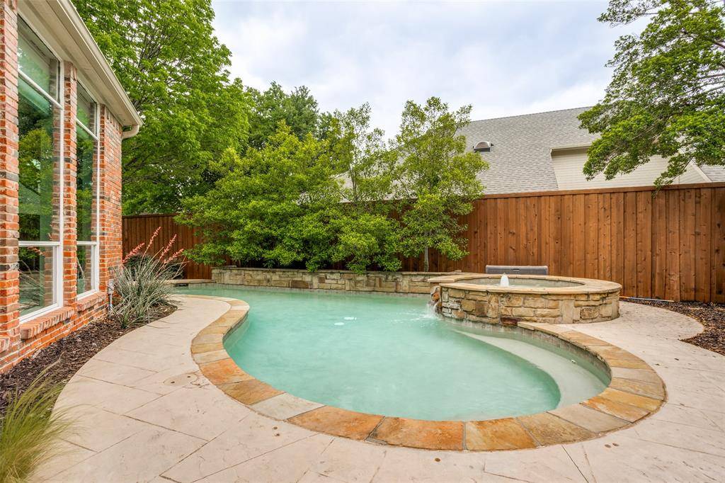 This beautifully updated home with a backyard oasis in the highly sought-after Windhaven Farm community of West Plano is set on a generous quarter-acre lot, just steps away from Windhaven Park and Muhlenbeck Rec Center. The floor plan offers flexibility to fit your lifestyle: the formal dining room can easily serve as a study or home office, while a second living area downstairs provides additional space for relaxation. A striking double-sided fireplace creates a warm, inviting flow that's ideal for entertaining and connects the breakfast area to the family room, where you'll find vaulted ceilings, built-ins and a wet bar. The kitchen has been updated with granite counters, a quartz island and a designer backsplash, plus tons of cabinet space, a butler's pantry, and a new induction cooktop. The private primary suite features wood floors and a cozy sitting area framed by bay windows that overlook the pool, along with a renovated en-suite bathroom that elevates everyday routines with quartz counters, new vanities, a frameless glass shower, LED mirrors and new fixtures. Upstairs are three additional bedrooms, one with the added convenience of its own private en-suite bathroom to provide extra comfort and privacy for visiting family or guests. Outside, the backyard is designed for year round enjoyment with a sparkling saltwater pool and spa surrounded by a board-on-board fence. The newly added side patio is an extended living space, equipped with mounted fans and a heater, speaker and TV wiring and a TV mount. Practical upgrades add peace of mind including Low-E windows, motorized designer shades, electric driveway gate, new AC system upstairs in 2023, new roof in 2023 and new gutters in 2025. Located within walking distance to Plano ISD elementary and middle schools and in an unbeatable location close to major employers, shopping, and dining, this home combines everyday convenience with elevated comfort.