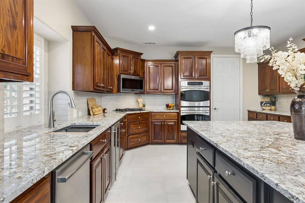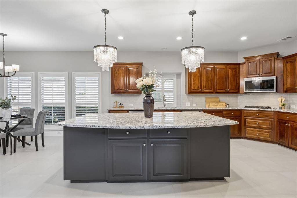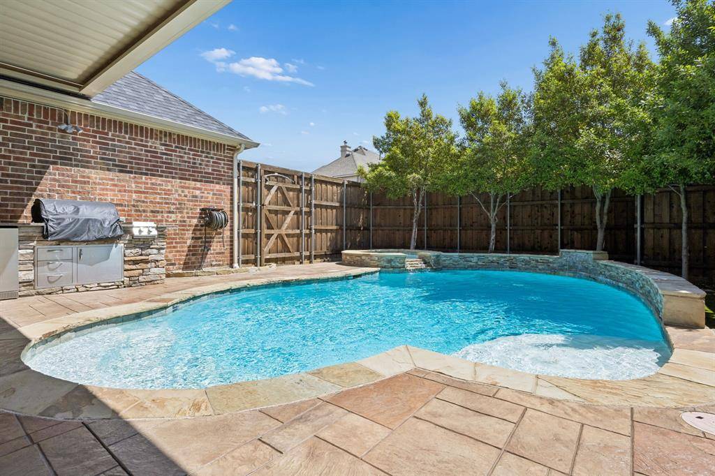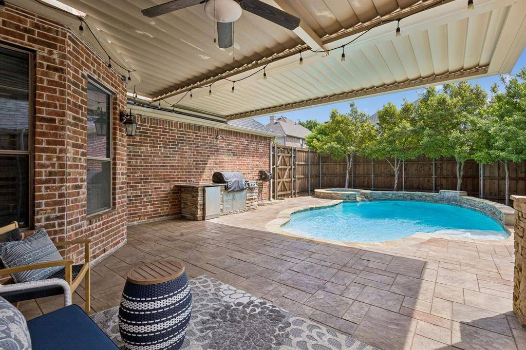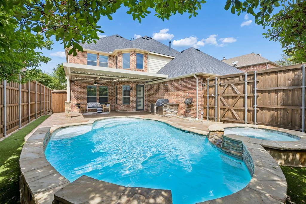 Experience year round entertaining and relaxation in your own backyard! Enjoy a heated pool and spa, a covered patio featuring a motorized louvered roof for customizable shade and comfort, an outdoor kitchen, complete with a built-in gas grill with burner (2024). Artificial turf makes for effortless and low-maintenance year round beauty.