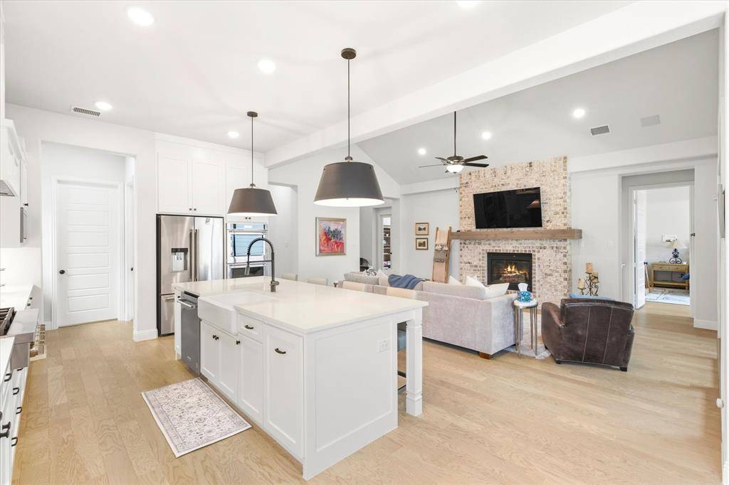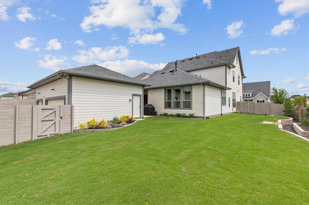 Welcome to 3920 Outpost Trail, an exceptional Drees-built semi-custom home in the sought-after Painted Tree community of McKinney. Situated on a premium corner lot adjacent to a peaceful greenbelt, this beautifully landscaped Southern-style residence offers timeless curb appeal with a spacious front porch perfect for relaxing evenings. Inside, you'll find a light and airy floor plan designed for both everyday living and entertaining. Hardwood floors flow throughout the first level, anchored by a stunning floor-to-ceiling brick fireplace in the family room. The open-concept layout connects seamlessly to the chef's kitchen and dining spaces, all enhanced by designer touches and abundant natural light. The spacious primary suite features dual vanities, a soaking garden tub, and a separate glass-enclosed shower. Each secondary bedroom is generously sized, offering comfort and flexibility for family or guests. Outside is a private backyard oasis, complete with a covered patio, outdoor fireplace, and a large grassy yard. Notable upgrades include whole-home automated Hunter Douglas shades, a fully integrated indoor outdoor speaker system, security wiring with cameras, and custom landscape design with stonework and accent lighting. Additional features like wood stairs, upgraded lighting, and a coated 3-car garage floor add to the home's elevated appeal. Located in the highly desirable Painted Tree neighborhood, residents enjoy scenic surroundings with convenient access to top-rated McKinney ISD schools, nearby parks, shopping, dining, over 25 miles of walking trails, and major thoroughfares for an easy commute.